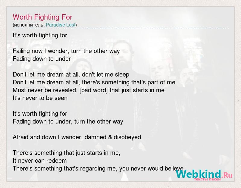 It's worth fighting for Failing now I wonder, turn the other way Fading down to under Don't let me dream at all, don't let me sleep Don't let me dream at all, there's something that's part of me Must never be revealed, [bad word] that just starts in me It's never to be seen It's worth fighting for Fading down to under, turn the other way Afraid and down I wander, damned & disobeyed There's something that just starts in me, It never can redeem There's something that's regarding me, you never would believe