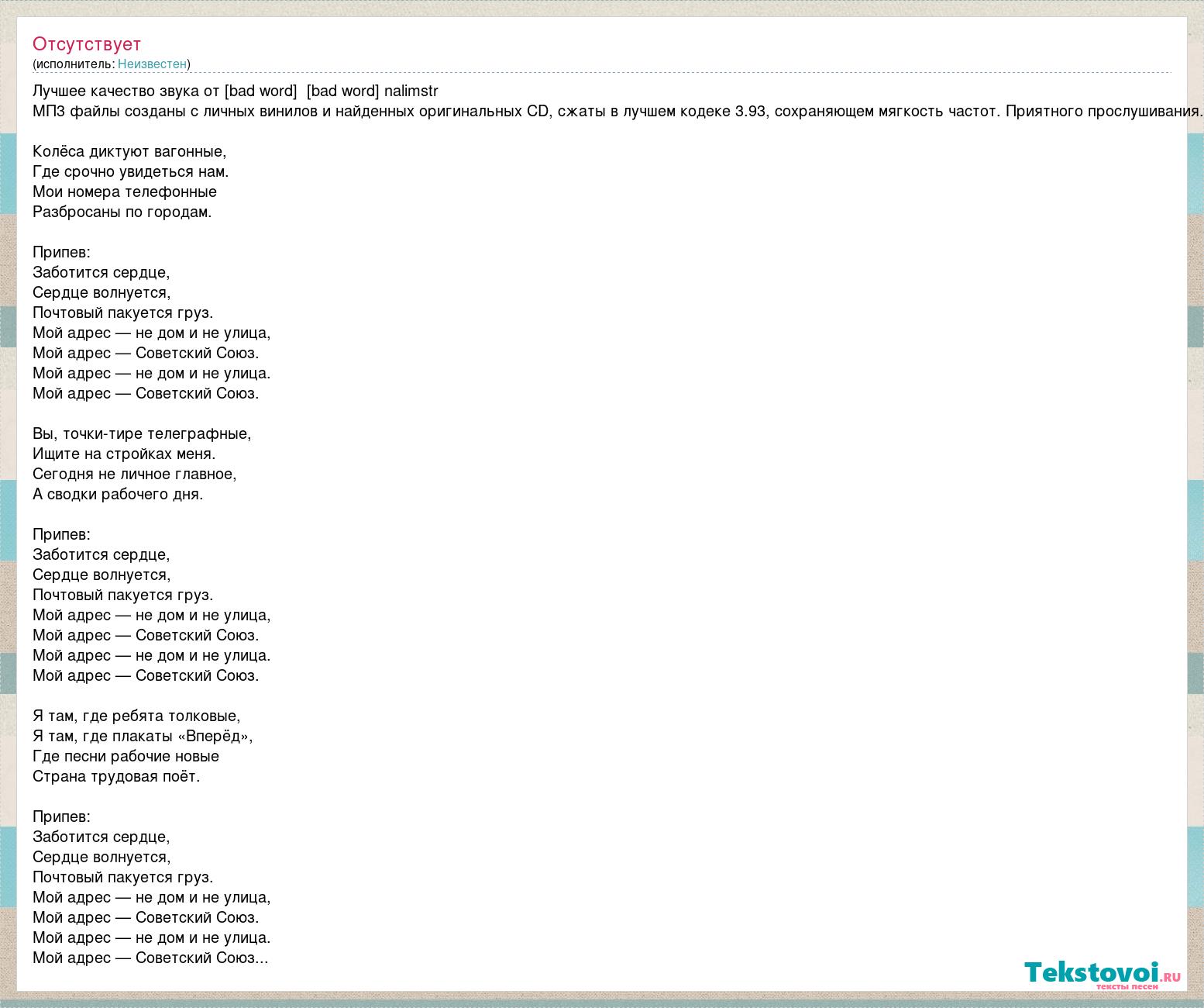 Лучшее качество звука от [bad word] [bad word] nalimstr МП3 файлы созданы с личных винилов и найденных оригинальных CD, сжаты в лучшем кодеке 3.93, сохраняющем мягкость частот. Приятного прослушивания. Колёса диктуют вагонные, Где срочно увидеться нам. Мои номера телефонные Разбросаны по городам. Припев: Заботится сердце, Сердце волнуется, Почтовый пакуется груз. Мой адрес — не дом и не улица, Мой адрес — Советский Союз. Мой адрес — не дом и не улица. Мой адрес — Советский Союз. Вы, точки-тире телеграфные, Ищите на стройках меня. Сегодня не личное главное, А сводки рабочего дня. Припев: Заботится сердце, Сердце волнуется, Почтовый пакуется груз. Мой адрес — не дом и не улица, Мой адрес — Советский Союз. Мой адрес — не дом и не улица. Мой адрес — Советский Союз. Я там, где ребята толковые, Я там, где плакаты «Вперёд», Где песни рабочие новые Страна трудовая поёт. Припев: Заботится сердце, Сердце волнуется, Почтовый пакуется груз. Мой адрес — не дом и не улица, Мой адрес — Советский Союз. Мой адрес — не дом и не улица. Мой адрес — Советский Союз...