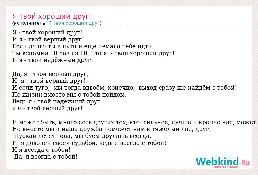 Я - твой хороший друг! И я - твой верный друг! Если долго ты в пути и ещё немало тебе идти, Ты вспомни 10 раз из 10, что я - твой хороший друг! И я - твой надёжный друг! Да, я - твой верный друг, И я - твой верный друг! И если туго, мы тогда вдвоём, конечно, выход сразу же найдём с тобой! По жизни вместе мы с тобой пойдем, Ведь я - твой надёжный друг, и я - твой верный друг! И может быть, много есть других тех, кто сильнее, лучше и крепче нас, может. Но вместе мы и наша дружба поможет нам в тяжёлый час, друг. Пускай летят года, мы буем дружить всегда. И я доволен своей судьбой, ведь я всегда с тобой! И я всегда с тобой! Да, я всегда с тобой!