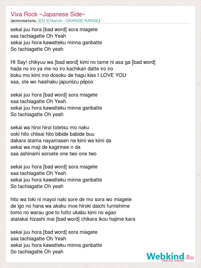 sekai juu hora [bad word] sora miagete saa tachiagatte Oh Yeah sekai juu hora kawatteku minna ganbatte So tachiagatte Oh yeah HI Say! chikyuu wa [bad word] kimi no tame ni asa ga [bad word] hada no iro ya me no iro kachikan datte iro iro boku mo kimi mo dosoku de hagu kiss I LOVE YOU saa, ote wo haishaku japuniizu piipoo sekai juu hora [bad word] sora miagete saa tachiagatte Oh Yeah sekai juu hora kawatteku minna ganbatte So tachiagatte Oh yeah sekai wa hiroi hiroi totetsu mo naku ooki hito chiisai hito bibide babide buu dakara atama nayamasen na kimi wa kimi da sekai wa maji de kagirinee n da saa ashinami soroete one two one two sekai juu hora [bad word] sora miagete saa tachiagatte Oh Yeah sekai juu hora kawatteku minna ganbatte So tachiagatte Oh yeah hito wa toki ni mayoi naki sore de mo sora wo miagete de igo no hana wa akaku moe hiroki daichi fumishime tomo no warau goe to futto ukabu kimi no egao atatakai hizashi mai [bad word] chikara ikou hajime kara sekai juu hora [bad word] sora miagete saa tachiagatte Oh Yeah sekai juu hora kawatteku minna ganbatte So tachiagatte Oh yeah
