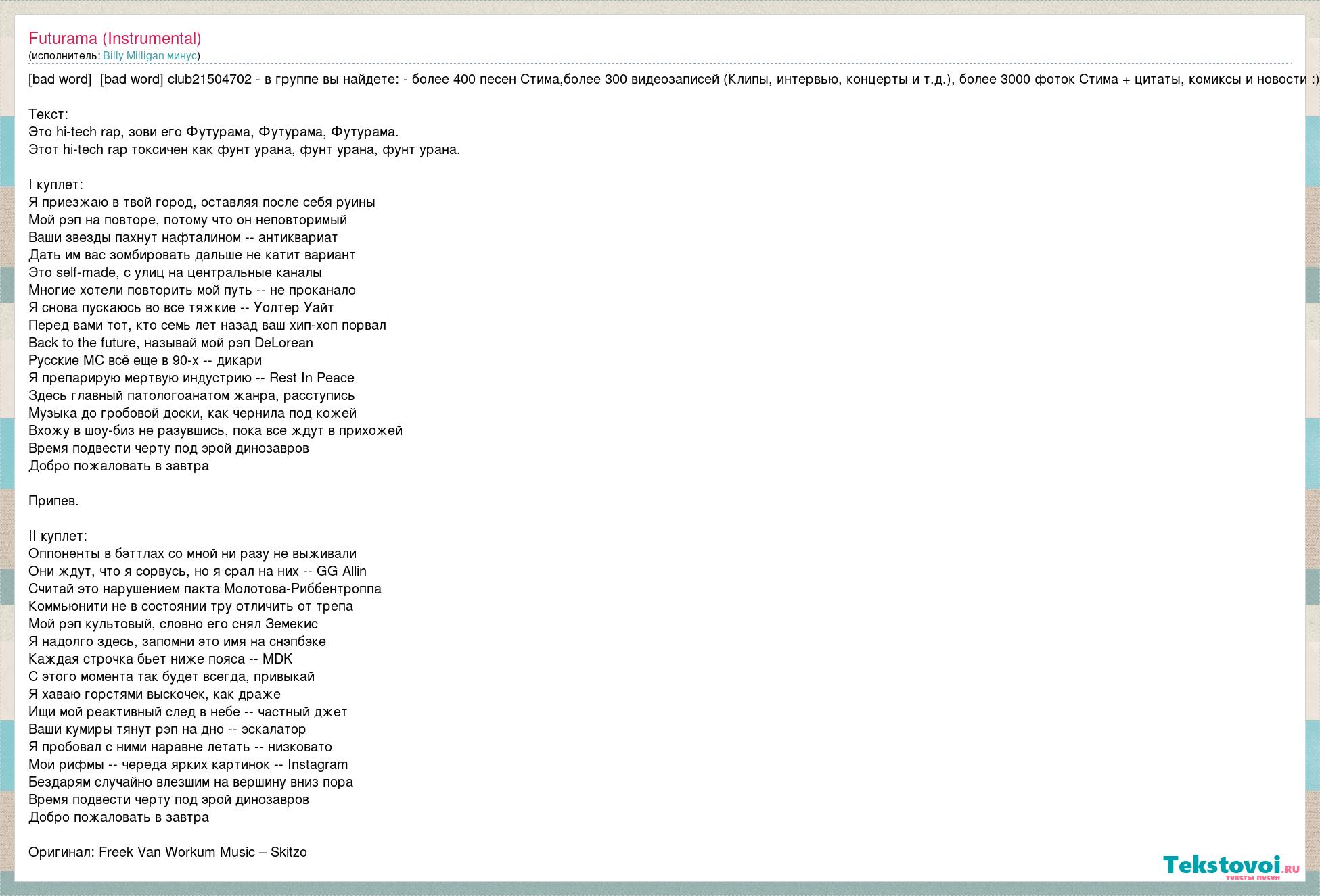 [bad word] [bad word] club21504702 - в группе вы найдете: - более 400 песен Стима,более 300 видеозаписей (Клипы, интервью, концерты и т.д.), более 3000 фоток Стима + цитаты, комиксы и новости :) Текст: Это hi-tech rap, зови его Футурама, Футурама, Футурама. Этот hi-tech rap токсичен как фунт урана, фунт урана, фунт урана. I куплет: Я приезжаю в твой город, оставляя после себя руины Мой рэп на повторе, потому что он неповторимый Ваши звезды пахнут нафталином -- антиквариат Дать им вас зомбировать дальше не катит вариант Это self-made, с улиц на центральные каналы Многие хотели повторить мой путь -- не проканало Я снова пускаюсь во все тяжкие -- Уолтер Уайт Перед вами тот, кто семь лет назад ваш хип-хоп порвал Back to the future, называй мой рэп DeLorean Русские MC всё еще в 90-х -- дикари Я препарирую мертвую индустрию -- Rest In Peace Здесь главный патологоанатом жанра, расступись Музыка до гробовой доски, как чернила под кожей Вхожу в шоу-биз не разувшись, пока все ждут в прихожей Время подвести черту под эрой динозавров Добро пожаловать в завтра Припев. II куплет: Оппоненты в бэттлах со мной ни разу не выживали Они ждут, что я сорвусь, но я срал на них -- GG Allin Считай это нарушением пакта Молотова-Риббентроппа Коммьюнити не в состоянии тру отличить от трепа Мой рэп культовый, словно его снял Земекис Я надолго здесь, запомни это имя на снэпбэке Каждая строчка бьет ниже пояса -- MDK С этого момента так будет всегда, привыкай Я хаваю горстями выскочек, как драже Ищи мой реактивный след в небе -- частный джет Ваши кумиры тянут рэп на дно -- эскалатор Я пробовал с ними наравне летать -- низковато Мои рифмы -- череда ярких картинок -- Instagram Бездарям случайно влезшим на вершину вниз пора Время подвести черту под эрой динозавров Добро пожаловать в завтра Оригинал: Freek Van Workum Music – Skitzo
