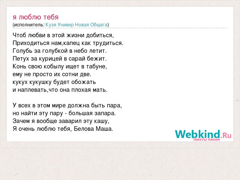 Чтоб любви в этой жизни добиться, Приходиться нам,капец как трудиться. Голубь за голубкой в небо летит. Петух за курицей в сарай бежит. Конь свою кобылу ищет в табуне, ему не просто их сотни две. кукух кукушку будет обожать и наплевать,что она плохая мать. У всех в этом мире должна быть пара, но найти эту пару - большая запара. Зачем я вообще заварил эту кашу, Я очень люблю тебя, Белова Маша.
