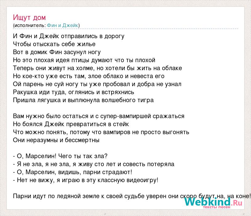 И Фин и Джейк отправились в дорогу Чтобы отыскать себе жилье Вот в домик Фин засунул ногу Но это плохая идея птицы думают что ты плохой Теперь они живут на холме, но хотели бы жить на облаке Но кое-кто уже есть там, злое облако и невеста его Ой парень не суй ногу ты уже пробовал и добра не узнал Ракушка иди туда, оглянись и встряхнись Пришла лягушка и выплюнула волшебного тигра Вам нужно было остаться и с супер-вампиршей сражаться Но боялся Джейк превратиться в стейк Что можно понять, потому что вампиров не просто выгонять Они неразумны и бессмертны - О, Марселин! Чего ты так зла? - Я не зла, я не зла, я живу сто лет и совесть потеряла - О, Марселин, видишь, парни страдают! - Нет не вижу, я играю в эту классную видеоигру! Парни идут по ледяной земле к своей судьбе уверен они скоро будут на, на коне!