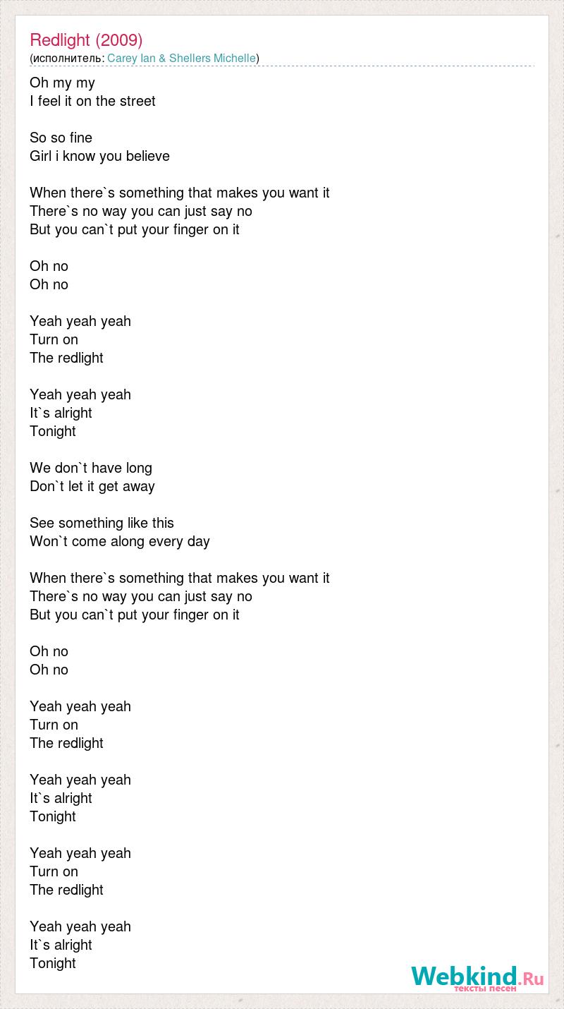 Oh my my I feel it on the street So so fine Girl i know you believe When there`s something that makes you want it There`s no way you can just say no But you can`t put your finger on it Oh no Oh no Yeah yeah yeah Turn on The redlight Yeah yeah yeah It`s alright Tonight We don`t have long Don`t let it get away See something like this Won`t come along every day When there`s something that makes you want it There`s no way you can just say no But you can`t put your finger on it Oh no Oh no Yeah yeah yeah Turn on The redlight Yeah yeah yeah It`s alright Tonight Yeah yeah yeah Turn on The redlight Yeah yeah yeah It`s alright Tonight