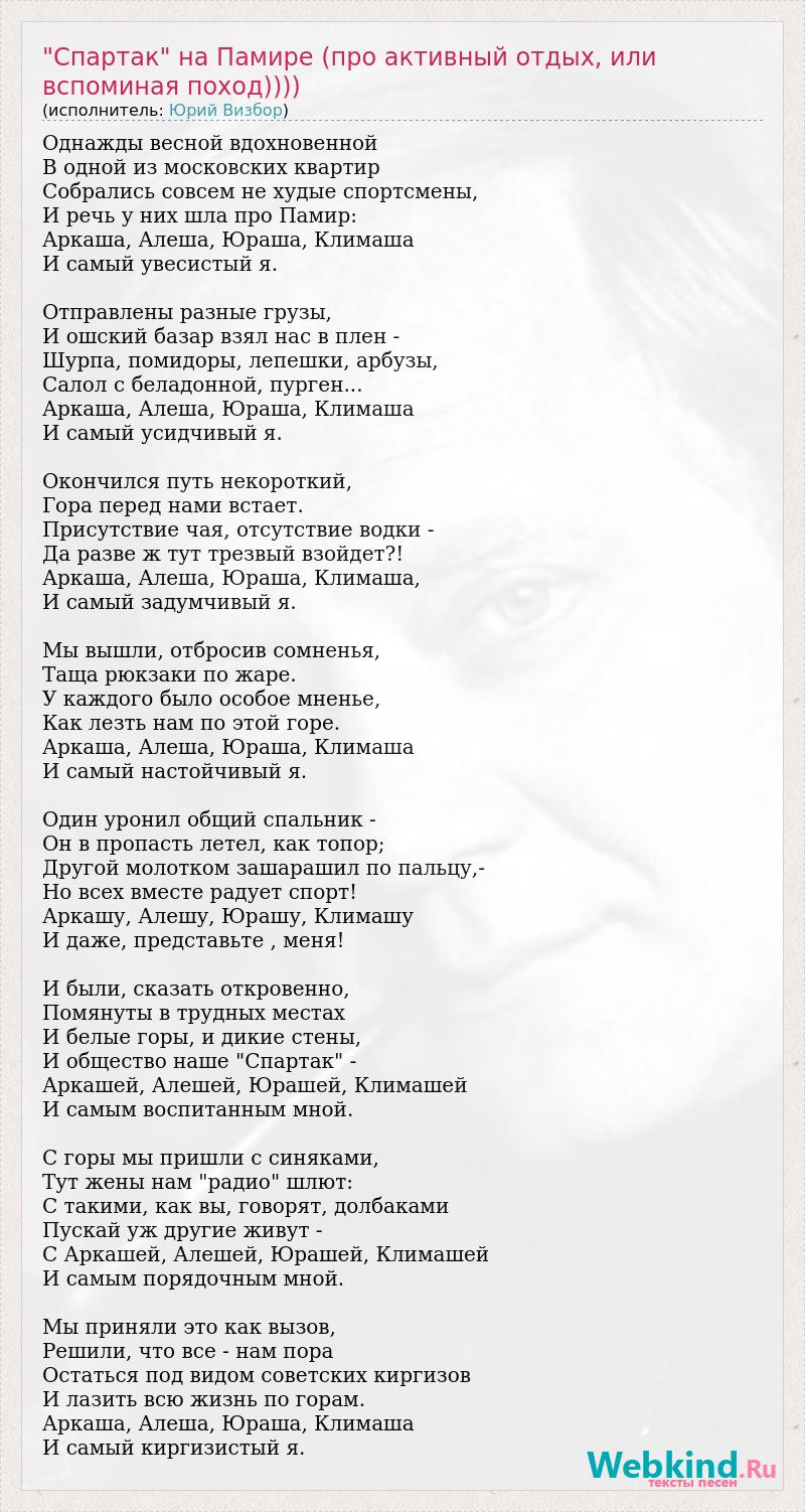 Однажды весной вдохновенной В одной из московских квартир Собрались совсем не худые спортсмены, И речь у них шла про Памир: Аркаша, Алеша, Юраша, Климаша И самый увесистый я. Отправлены разные грузы, И ошский базар взял нас в плен - Шурпа, помидоры, лепешки, арбузы, Салол с беладонной, пурген... Аркаша, Алеша, Юраша, Климаша И самый усидчивый я. Окончился путь некороткий, Гора перед нами встает. Присутствие чая, отсутствие водки - Да разве ж тут трезвый взойдет?! Аркаша, Алеша, Юраша, Климаша, И самый задумчивый я. Мы вышли, отбросив сомненья, Таща рюкзаки по жаре. У каждого было особое мненье, Как лезть нам по этой горе. Аркаша, Алеша, Юраша, Климаша И самый настойчивый я. Один уронил общий спальник - Он в пропасть летел, как топор; Другой молотком зашарашил по пальцу,- Но всех вместе радует спорт! Аркашу, Алешу, Юрашу, Климашу И даже, представьте , меня! И были, сказать откровенно, Помянуты в трудных местах И белые горы, и дикие стены, И общество наше "Спартак" - Аркашей, Алешей, Юрашей, Климашей И самым воспитанным мной. С горы мы пришли с синяками, Тут жены нам "радио" шлют: С такими, как вы, говорят, долбаками Пускай уж другие живут - С Аркашей, Алешей, Юрашей, Климашей И самым порядочным мной. Мы приняли это как вызов, Решили, что все - нам пора Остаться под видом советских киргизов И лазить всю жизнь по горам. Аркаша, Алеша, Юраша, Климаша И самый киргизистый я.
