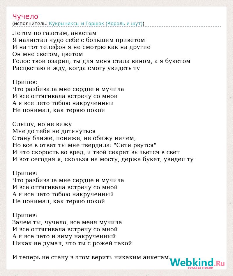 Летом по газетам, анкетам Я налистал чудо себе с большим приветом И на тот телефон я не смотрю как на другие Он мне светом, цветом Голос твой озарил, ты для меня стала вином, а я букетом Расцветаю и жду, когда смогу увидеть ту Припев: Что разбивала мне сердце и мучила И все оттягивала встречу со мной А я все лето тобою накрученный Не понимал, как теряю покой Слышу, но не вижу Мне до тебя не дотянуться Стану ближе, пониже, не обижу ничем, Но все в ответ ты мне твердила: "Сети рвутся" И что скорость во вред, и твой секрет выльется в свет И вот сегодня я, скользя на мосту, держа букет, увидел ту Припев: Что разбивала мне сердце и мучила И все оттягивала встречу со мной А я все лето тобою накрученный Не понимал, как теряю покой Припев: Зачем ты, чучело, все меня мучила И все оттягивала встречу со мной А я все лето и зиму накрученный Никак не думал, что ты с рожей такой И теперь не стану в этом верить никаким анкетам..