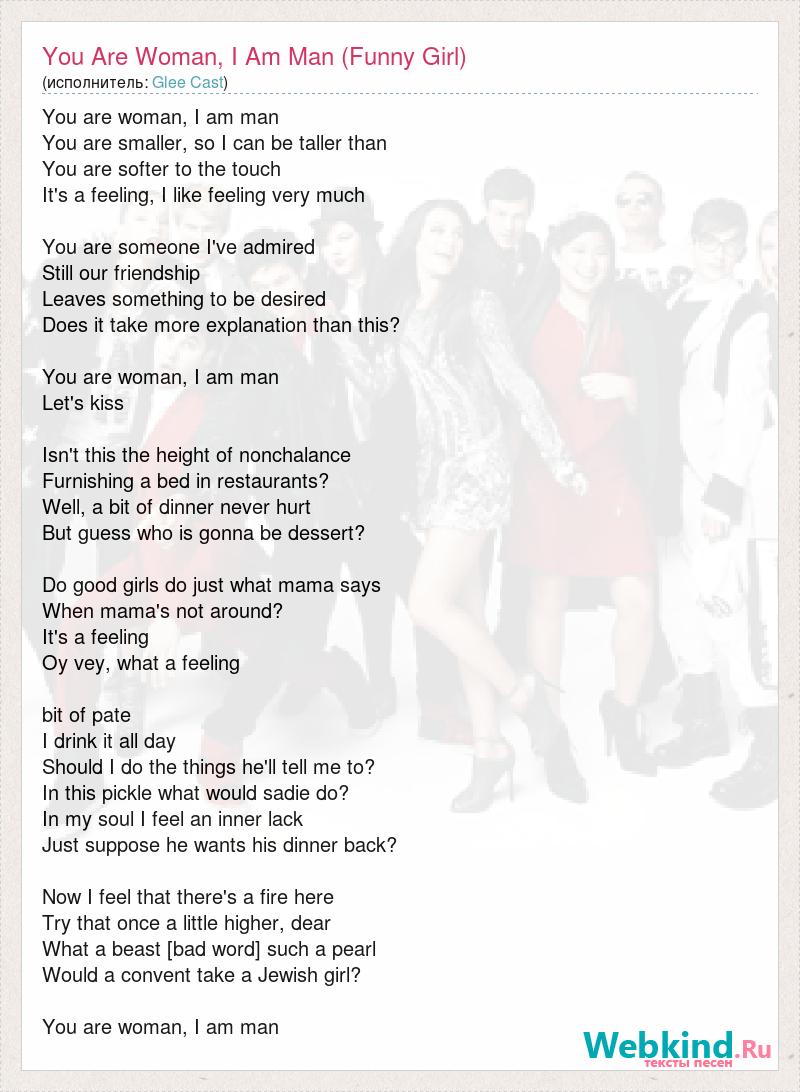 You are woman, I am man You are smaller, so I can be taller than You are softer to the touch It's a feeling, I like feeling very much You are someone I've admired Still our friendship Leaves something to be desired Does it take more explanation than this? You are woman, I am man Let's kiss Isn't this the height of nonchalance Furnishing a bed in restaurants? Well, a bit of dinner never hurt But guess who is gonna be dessert? Do good girls do just what mama says When mama's not around? It's a feeling Oy vey, what a feeling bit of pate I drink it all day Should I do the things he'll tell me to? In this pickle what would sadie do? In my soul I feel an inner lack Just suppose he wants his dinner back? Now I feel that there's a fire here Try that once a little higher, dear What a beast [bad word] such a pearl Would a convent take a Jewish girl? You are woman, I am man