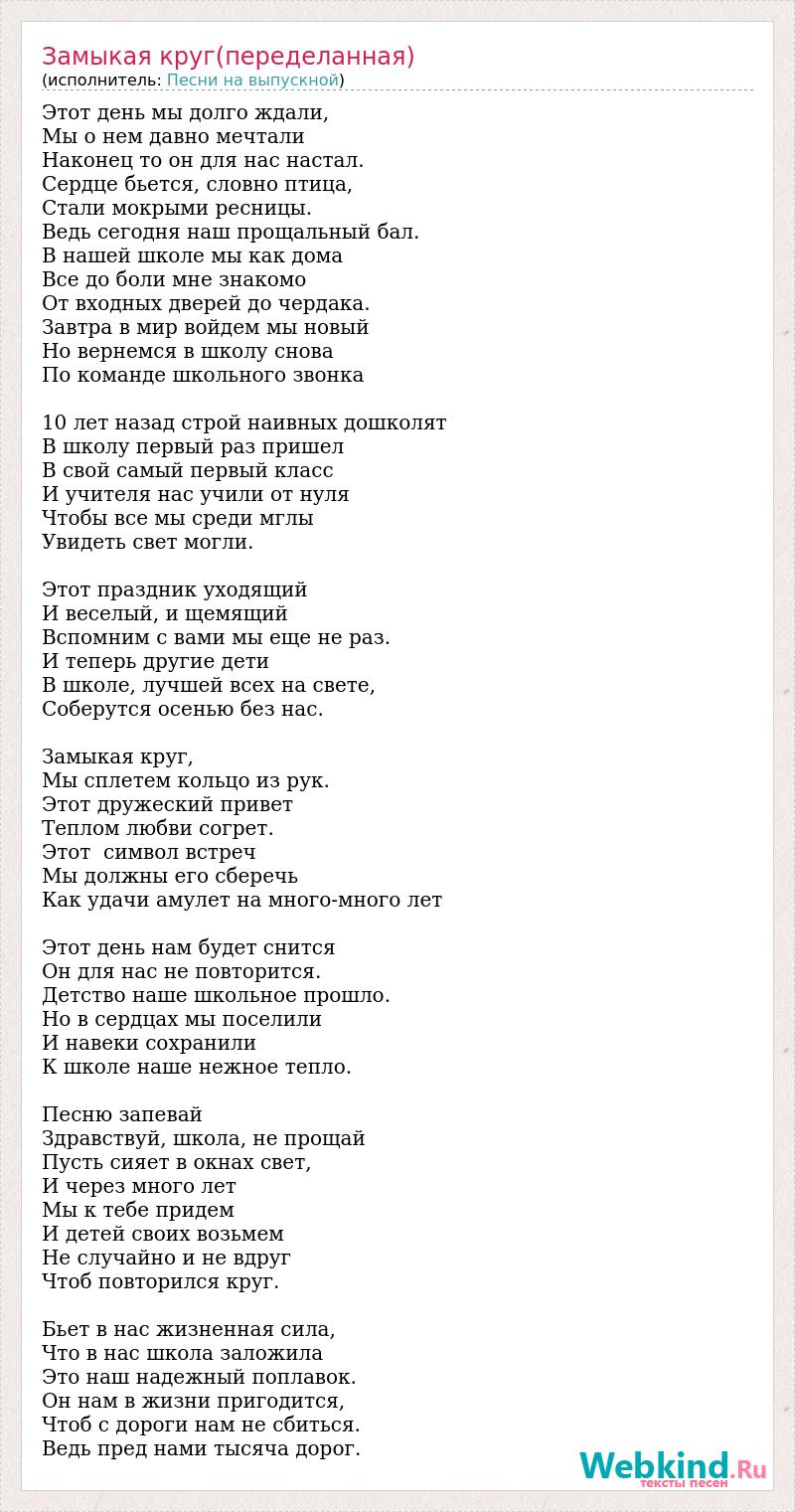 Этот день мы долго ждали, Мы о нем давно мечтали Наконец то он для нас настал. Сердце бьется, словно птица, Стали мокрыми ресницы. Ведь сегодня наш прощальный бал. В нашей школе мы как дома Все до боли мне знакомо От входных дверей до чердака. Завтра в мир войдем мы новый Но вернемся в школу снова По команде школьного звонка 10 лет назад строй наивных дошколят В школу первый раз пришел В свой самый первый класс И учителя нас учили от нуля Чтобы все мы среди мглы Увидеть свет могли. Этот праздник уходящий И веселый, и щемящий Вспомним с вами мы еще не раз. И теперь другие дети В школе, лучшей всех на свете, Соберутся осенью без нас. Замыкая круг, Мы сплетем кольцо из рук. Этот дружеский привет Теплом любви согрет. Этот символ встреч Мы должны его сберечь Как удачи амулет на много-много лет Этот день нам будет снится Он для нас не повторится. Детство наше школьное прошло. Но в сердцах мы поселили И навеки сохранили К школе наше нежное тепло. Песню запевай Здравствуй, школа, не прощай Пусть сияет в окнах свет, И через много лет Мы к тебе придем И детей своих возьмем Не случайно и не вдруг Чтоб повторился круг. Бьет в нас жизненная сила, Что в нас школа заложила Это наш надежный поплавок. Он нам в жизни пригодится, Чтоб с дороги нам не сбиться. Ведь пред нами тысяча дорог.