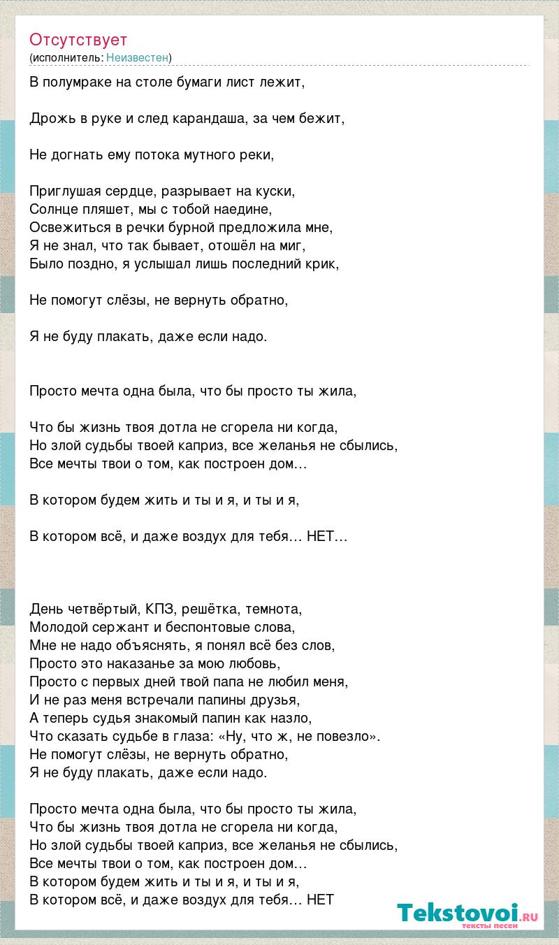 В полумраке на столе бумаги лист лежит, Дрожь в руке и след карандаша, за чем бежит, Не догнать ему потока мутного реки, Приглушая сердце, разрывает на куски, Солнце пляшет, мы с тобой наедине, Освежиться в речки бурной предложила мне, Я не знал, что так бывает, отошёл на миг, Было поздно, я услышал лишь последний крик, Не помогут слёзы, не вернуть обратно, Я не буду плакать, даже если надо. Просто мечта одна была, что бы просто ты жила, Что бы жизнь твоя дотла не сгорела ни когда, Но злой судьбы твоей каприз, все желанья не сбылись, Все мечты твои о том, как построен дом… В котором будем жить и ты и я, и ты и я, В котором всё, и даже воздух для тебя… НЕТ… День четвёртый, КПЗ, решётка, темнота, Молодой сержант и беспонтовые слова, Мне не надо объяснять, я понял всё без слов, Просто это наказанье за мою любовь, Просто с первых дней твой папа не любил меня, И не раз меня встречали папины друзья, А теперь судья знакомый папин как назло, Что сказать судьбе в глаза: «Ну, что ж, не повезло». Не помогут слёзы, не вернуть обратно, Я не буду плакать, даже если надо. Просто мечта одна была, что бы просто ты жила, Что бы жизнь твоя дотла не сгорела ни когда, Но злой судьбы твоей каприз, все желанья не сбылись, Все мечты твои о том, как построен дом… В котором будем жить и ты и я, и ты и я, В котором всё, и даже воздух для тебя… НЕТ