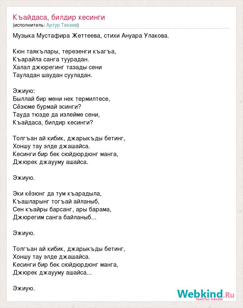 Музыка Мустафира Жеттеева, стихи Ануара Улакова. Кюн таякълары, терезенги къагъа, Къарайла санга туурадан. Халал джюрегинг тазады сени Тауладан шаудан сууладан. Эжиую: Быллай бир мени нек термилтесе, Сёзюме бурмай эсинги? Тауда тюзде да излейме сени, Къайдаса, билдир кесинги? Толгъан ай кибик, джарыкъды бетинг, Хоншу тау элде джашайса. Кесинги бир бек сюйдюрдюнг манга, Джюрек джаууму ашайса. Эжиую. Эки кёзюнг да тум къарадыла, Къашларынг тогъай айланыб, Сен къайры барсанг, ары барама, Джюрегим санга байланыб... Эжиую. Толгъан ай кибик, джарыкъды бетинг, Хоншу тау элде джашайса. Кесинги бир бек сюйдюрдюнг манга, Джюрек джаууму ашайса... Эжиую.