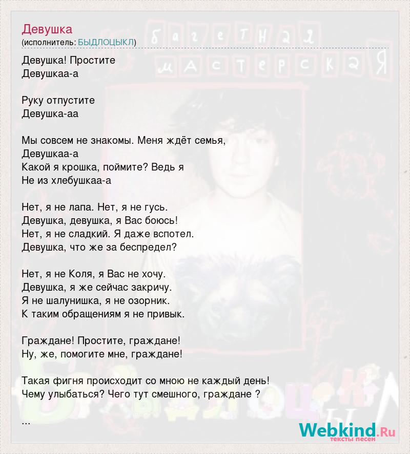 Девушка! Простите Девушкаа-а Руку отпустите Девушка-аа Мы совсем не знакомы. Меня ждёт семья, Девушкаа-а Какой я крошка, поймите? Ведь я Не из хлебушкаа-а Нет, я не лапа. Нет, я не гусь. Девушка, девушка, я Вас боюсь! Нет, я не сладкий. Я даже вспотел. Девушка, что же за беспредел? Нет, я не Коля, я Вас не хочу. Девушка, я же сейчас закричу. Я не шалунишка, я не озорник. К таким обращениям я не привык. Граждане! Простите, граждане! Ну, же, помогите мне, граждане! Такая фигня происходит со мною не каждый день! Чему улыбаться? Чего тут смешного, граждане ? ...