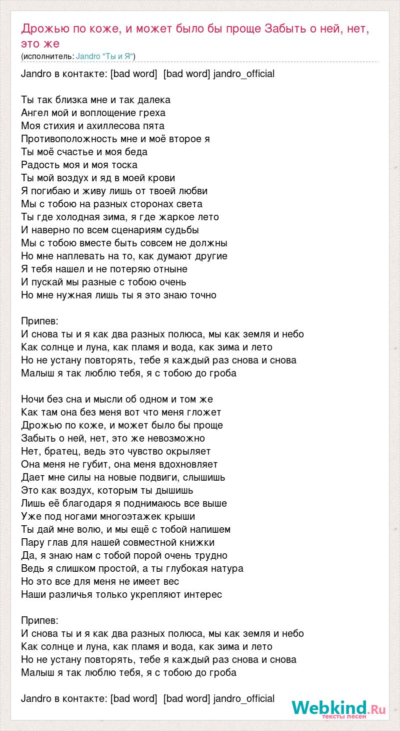 Jandro в контакте: [bad word] [bad word] jandro_official Ты так близка мне и так далека Ангел мой и воплощение греха Моя стихия и ахиллесова пята Противоположность мне и моё второе я Ты моё счастье и моя беда Радость моя и моя тоска Ты мой воздух и яд в моей крови Я погибаю и живу лишь от твоей любви Мы с тобою на разных сторонах света Ты где холодная зима, я где жаркое лето И наверно по всем сценариям судьбы Мы с тобою вместе быть совсем не должны Но мне наплевать на то, как думают другие Я тебя нашел и не потеряю отныне И пускай мы разные с тобою очень Но мне нужная лишь ты я это знаю точно Припев: И снова ты и я как два разных полюса, мы как земля и небо Как солнце и луна, как пламя и вода, как зима и лето Но не устану повторять, тебе я каждый раз снова и снова Малыш я так люблю тебя, я с тобою до гроба Ночи без сна и мысли об одном и том же Как там она без меня вот что меня гложет Дрожью по коже, и может было бы проще Забыть о ней, нет, это же невозможно Нет, братец, ведь это чувство окрыляет Она меня не губит, она меня вдохновляет Дает мне силы на новые подвиги, слышишь Это как воздух, которым ты дышишь Лишь её благодаря я поднимаюсь все выше Уже под ногами многоэтажек крыши Ты дай мне волю, и мы ещё с тобой напишем Пару глав для нашей совместной книжки Да, я знаю нам с тобой порой очень трудно Ведь я слишком простой, а ты глубокая натура Но это все для меня не имеет вес Наши различья только укрепляют интерес Припев: И снова ты и я как два разных полюса, мы как земля и небо Как солнце и луна, как пламя и вода, как зима и лето Но не устану повторять, тебе я каждый раз снова и снова Малыш я так люблю тебя, я с тобою до гроба Jandro в контакте: [bad word] [bad word] jandro_official