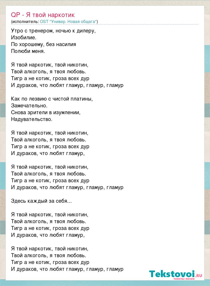 Утро с тренером, ночью к дилеру, Изобилие. По хорошему, без насилия Полюби меня. Я твой наркотик, твой никотин, Твой алкоголь, я твоя любовь. Тигр а не котик, гроза всех дур И дураков, что любят гламур, гламур, гламур Как по лезвию с чистой платины, Замечательно. Снова зрители в изумлении, Надувательство. Я твой наркотик, твой никотин, Твой алкоголь, я твоя любовь. Тигр а не котик, гроза всех дур И дураков, что любят гламур, Я твой наркотик, твой никотин, Твой алкоголь, я твоя любовь. Тигр а не котик, гроза всех дур И дураков, что любят гламур, гламур, гламур Здесь каждый за себя... Я твой наркотик, твой никотин, Твой алкоголь, я твоя любовь. Тигр а не котик, гроза всех дур И дураков, что любят гламур, Я твой наркотик, твой никотин, Твой алкоголь, я твоя любовь. Тигр а не котик, гроза всех дур И дураков, что любят гламур, гламур, гламур