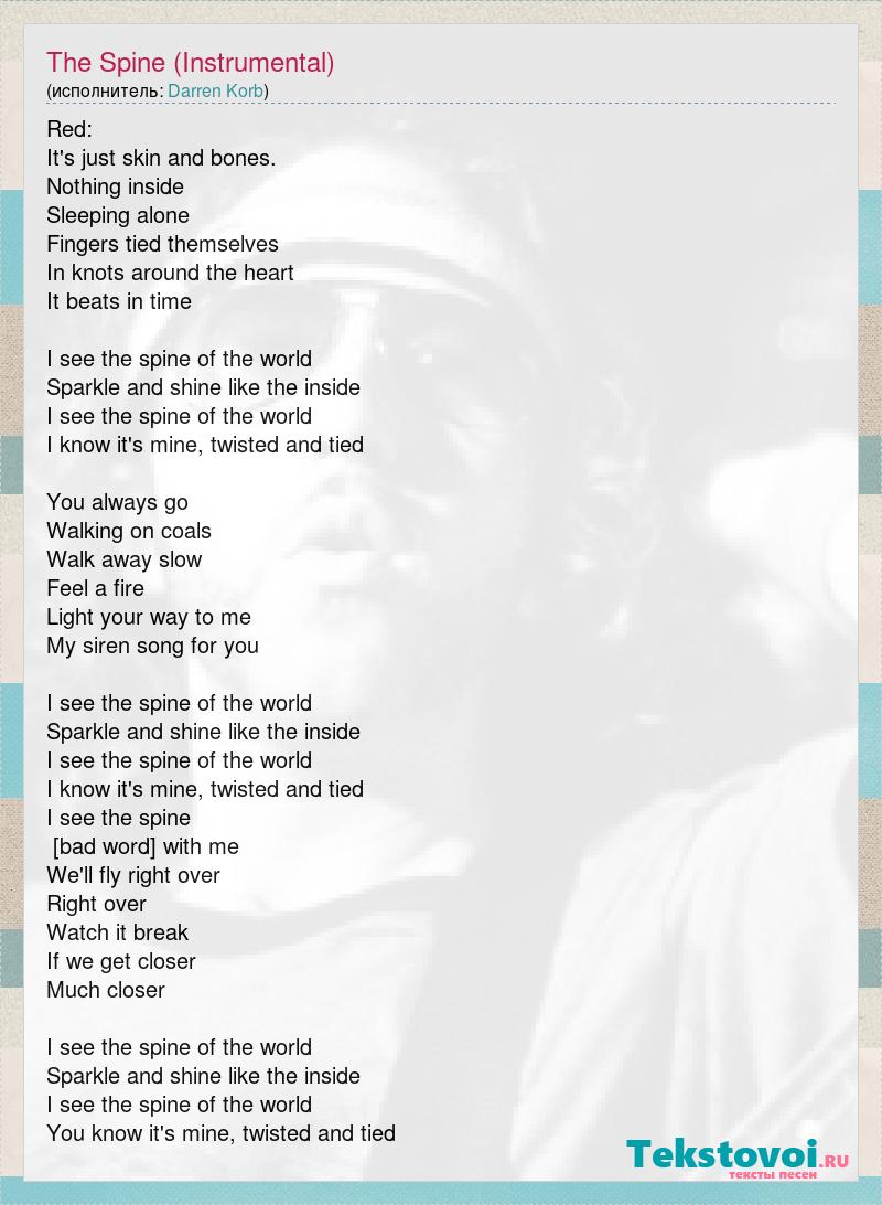 Red: It's just skin and bones. Nothing inside Sleeping alone Fingers tied themselves In knots around the heart It beats in time I see the spine of the world Sparkle and shine like the inside I see the spine of the world I know it's mine, twisted and tied You always go Walking on coals Walk away slow Feel a fire Light your way to me My siren song for you I see the spine of the world Sparkle and shine like the inside I see the spine of the world I know it's mine, twisted and tied I see the spine [bad word] with me We'll fly right over Right over Watch it break If we get closer Much closer I see the spine of the world Sparkle and shine like the inside I see the spine of the world You know it's mine, twisted and tied