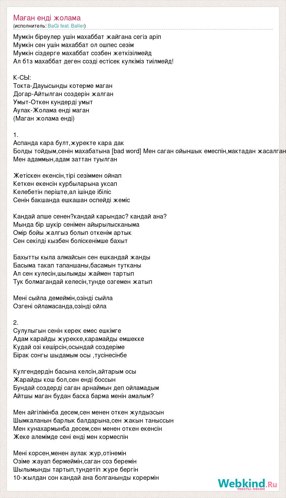Мумкiн бiреулер ушiн махаббат жайгана сегiз арiп Мумкiн сен ушiн махаббат ол ошпес сезiм Мумкiн сiздерге махаббат созбен жеткiзiлмейд Ал б1з махаббат деген создi естiсек кулкiмiз тиiлмейд! К-СЫ: Токта-Дауысынды котерме маган Догар-Айтылган создерiн жалган Умыт-Откен кундердi умыт Аулак-Жолама ендi маган (Маган жолама ендi) 1. Аспанда кара булт,журекте кара дак Болды тойдым,сенiн махабатына [bad word] Мен саган ойыншык емеспiн,мактадан жасалган Мен адаммын,адам заттан туылган Жетiскен екенсiн,тiрi сезiммен ойнап Кеткен екенсiн курбыларына уксап Келебетiн перiште,ал iшiнде iбiлiс Сенiн бакшанда ешкашан оспейдi жемiс Кандай апше сенен?кандай карындас? кандай ана? Мында бiр шукiр сенiмен айырылысканыма Омiр бойы жалгыз болып откенiм артык Сен секiлдi кызбен болiскенiмше бахыт Бахытты кыла алмайсын сен ешкандай жанды Басыма такап тапаншаны,басамын тутканы Ал сен кулесiн,шылымды жаймен тартып Тук болмагандай келесiн,тунде озгемен жатып Менi сыйла демеймiн,озiндi сыйла Озгенi ойламасанда,озiндi ойла 2. Сулулыгын сенiн керек емес ешкiмге Адам карайды журекке,карамайды емшекке Кудай озi кешiрсiн,осындай создерiме Бiрак сонгы шыдамым осы ,тусiнесiнбе Кулгендердiн басына келсiн,айтарым осы Жарайды кош бол,сен ендi боссын Бундай создердi саган арнаймын деп ойламадым Айтшы маган будан баска барма менiн амалым? Мен айгiлiмiнба десем,сен менен откен жулдызсын Шымкаланын барлык балдарына,сен жакын таныссын Мен кунахармынба десем,сен менен откен екенсiн Жеке алемiмде сенi ендi мен кормеспiн Менi корсен,менен аулак жур,отiнемiн Озiме жауап бермеймiн,саган соз беремiн Шылымынды тартып,тундетiп журе бергiн 10-жылдан сон кандай ана болганынды корермiн