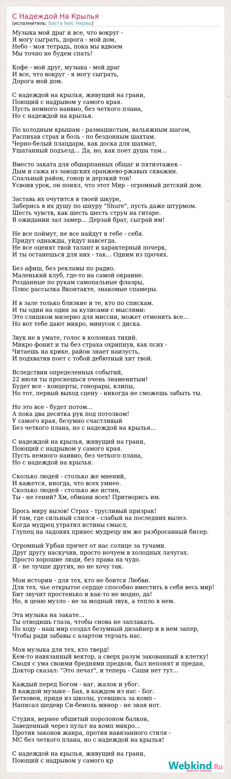 Музыка мой драг и все, что вокруг - Я могу сыграть, дорога - мой дом, Небо - моя тетрадь, пока мы вдвоем Мы точно не будем спать! Кофе - мой друг, музыка - мой драг И все, что вокруг - я могу сыграть, Дорога мой дом. С надеждой на крылья, живущий на грани, Поющий с надрывом у самого края. Пусть немного наивно, без четкого плана, Но с надеждой на крылья. По холодным крышам - размашистым, вальяжным шагом, Распихав страх и боль - по бездонным шахтам. Черно-белый плацдарм, как доска для шахмат, Ушатанный подъезд... Да, но, как поет душа там... Вместо заката для обшарпанных общаг и пятиэтажек - Дым и сажа из заводских оранжево-ржавых скважин. Спальный район, гонор и дерзкий тон! Усвоив урок, он понял, что этот Мир - огромный детский дом. Заставь их очутится в твоей шкуре, Заберись в их душу по шнуру "Shure", пусть даже штурмом. Шесть чувств, как шесть шесть струн на гитаре. В ожидании зал замер... Дерзай брат, сыграй им! Не все поймут, не все найдут в тебе - себя. Придут однажды, уйдут навсегда. Не все оценят твой талант и характерный почерк, И ты останешься для них - так... Одним из прочих. Без афиш, без рекламы по радио. Маленький клуб, где-то на самой окраине. Розданные по рукам самопальные флаэры, Плюс рассылка Вконтакте, знакомые спамеры. И в зале только близкие и те, кто по спискам. И ты один на один за кулисами с мыслями: Это слишком мизерно для миссии, может отменить все... Но вот тебе дают микро, минусок с диска. Звук не в умате, голос в колонках тихий. Микро фонит и ты без страха охрипнув, как псих - Читаешь на крике, район знает наизусть, И подхватив поет с тобой дебютный хит твой. Вследствии определенных событий, 22 июля ты проснешься очень знаменитым! Будет все - концерты, гонорары, клипы, Но тот, первый выход сцену - никогда не сможешь забыть ты. Но это все - будет потом... А пока два десятка рук под потолком! У самого края, безумно счастливый Без четкого плана, но с надеждой на крылья... С надеждой на крылья, живущий на грани, Поющий с надрывом у самого края. Пусть немного наивно, без четкого плана, Но с надеждой на крылья. Сколько людей - столько же мнений, И кажется, иногда, что всех умнее. Сколько людей - столько же истин, Ты - не гений? Хм, обмани всех! Притворись им. Брось миру вызов! Страх - трусливый призрак! И там, где сильный слился - слабый на последних вылез. Когда мудрец утратил истины смысл, Глупец на ладонях принес мудрецу им же разбросанный бисер. Огромный Урбан прячет от нас солнце за тучами. Друг другу наскучив, просто ночуем в холодных лачугах. Просто хорошие люди, без права на чудо. Я - не лучше других, но не хочу так. Мои истории - для тех, кто не боится Любви. Для тех, чье открытое сердце способно вместить в себя весь мир! Бит звучит простенько и как-то не модно, да! Но, я ценю музло - не за модный звук, а тепло в нем. Эта музыка на закате... Ты отводишь глаза, чтобы снова не заплакать. По ходу - наш мир создал безумный дизайнер и в нем запер, Чтобы ради забавы с азартом терзать нас. Моя музыка для тех, кто тверд! Кем-то навязанный вектор, а сверх разум закованный в клетку! Сводя с ума своими бреднями предков, был непонят и предан, Доктор сказал: "Это лечат", и теперь - Саши нет тут... Каждый перед Богом - наг, жалок и убог. В каждой музыке - Бах, в каждом из нас - Бог. Бетховен, придя из школы, усевшись за комп - Написал шедевр Си-бемоль минор - не зная нот. Студия, вернее обшитый поролоном балкон, Заведен