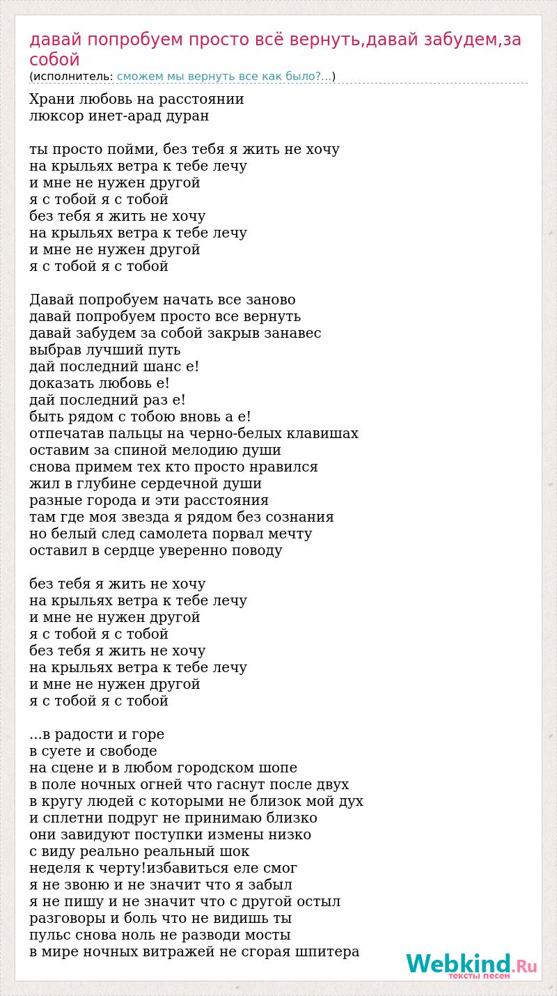 Храни любовь на расстоянии люксор инет-арад дуран ты просто пойми, без тебя я жить не хочу на крыльях ветра к тебе лечу и мне не нужен другой я с тобой я с тобой без тебя я жить не хочу на крыльях ветра к тебе лечу и мне не нужен другой я с тобой я с тобой Давай попробуем начать все заново давай попробуем просто все вернуть давай забудем за собой закрыв занавес выбрав лучший путь дай последний шанс е! доказать любовь е! дай последний раз е! быть рядом с тобою вновь а е! отпечатав пальцы на черно-белых клавишах оставим за спиной мелодию души снова примем тех кто просто нравился жил в глубине сердечной души разные города и эти расстояния там где моя звезда я рядом без сознания но белый след самолета порвал мечту оставил в сердце уверенно поводу без тебя я жить не хочу на крыльях ветра к тебе лечу и мне не нужен другой я с тобой я с тобой без тебя я жить не хочу на крыльях ветра к тебе лечу и мне не нужен другой я с тобой я с тобой ...в радости и горе в суете и свободе на сцене и в любом городском шопе в поле ночных огней что гаснут после двух в кругу людей с которыми не близок мой дух и сплетни подруг не принимаю близко они завидуют поступки измены низко с виду реально реальный шок неделя к черту!избавиться еле смог я не звоню и не значит что я забыл я не пишу и не значит что с другой остыл разговоры и боль что не видишь ты пульс снова ноль не разводи мосты в мире ночных витражей не сгорая шпитера