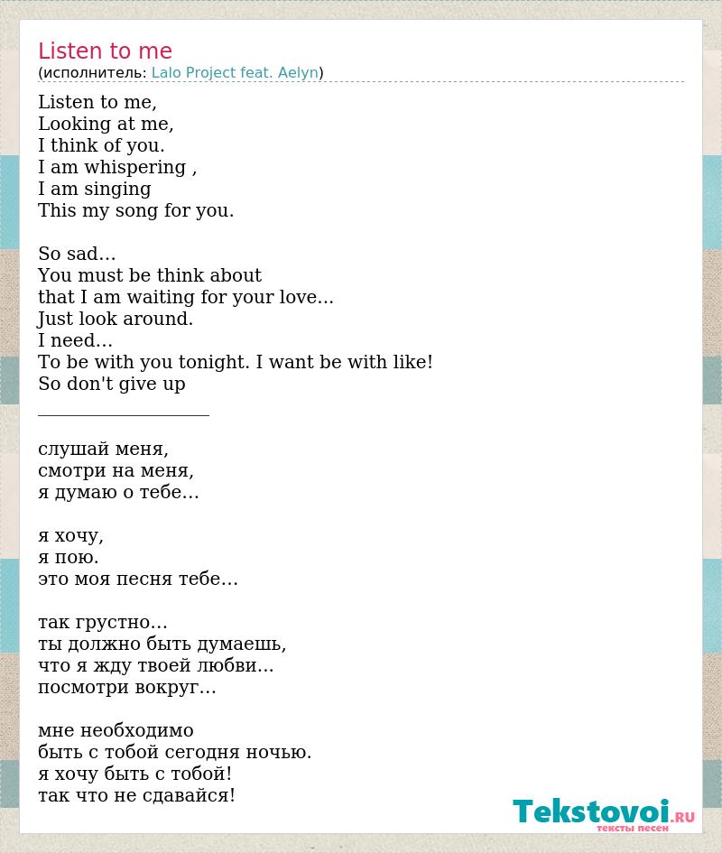 Listen to me, Looking at me, I think of you. I am whispering , I am singing This my song for you. So sad… You must be think about that I am waiting for your love... Just look around. I need… To be with you tonight. I want be with like! So don't give up ___________________ слушай меня, смотри на меня, я думаю о тебе… я хочу, я пою. это моя песня тебе… так грустно… ты должно быть думаешь, что я жду твоей любви... посмотри вокруг… мне необходимо быть с тобой сегодня ночью. я хочу быть с тобой! так что не сдавайся!