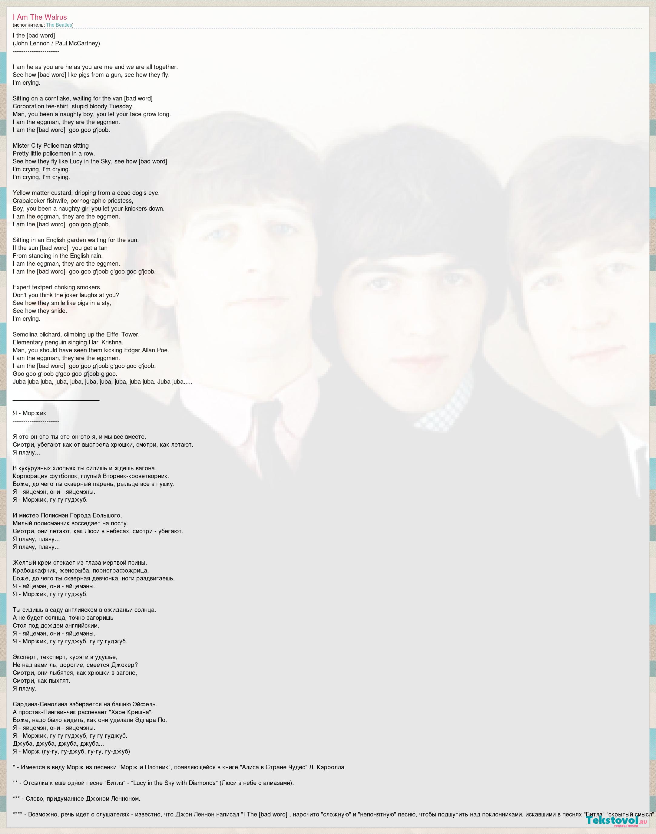 I the Walrus (John Lennon / Paul McCartney) ---------------------- I am he as you are he as you are me and we are all together. See how they run like pigs from a gun, see how they fly. I'm crying. Sitting on a cornflake, waiting for the van to come. Corporation tee-shirt, stupid bloody Tuesday. Man, you been a naughty boy, you let your face grow long. I am the eggman, they are the eggmen. I am the walrus, goo goo g'joob. Mister City Policeman sitting Pretty little policemen in a row. See how they fly like Lucy in the Sky, see how they run. I'm crying, I'm crying. I'm crying, I'm crying. Yellow matter custard, dripping from a dead dog's eye. Crabalocker fishwife, pornographic priestess, Boy, you been a naughty girl you let your knickers down. I am the eggman, they are the eggmen. I am the walrus, goo goo g'joob. Sitting in an English garden waiting for the sun. If the sun don't come, you get a tan From standing in the English rain. I am the eggman, they are the eggmen. I am the walrus, goo goo g'joob g'goo goo g'joob. Expert textpert choking smokers, Don't you think the joker laughs at you? See how they smile like pigs in a sty, See how they snide. I'm crying. Semolina pilchard, climbing up the Eiffel Tower. Elementary penguin singing Hari Krishna. Man, you should have seen them kicking Edgar Allan Poe. I am the eggman, they are the eggmen. I am the walrus, goo goo g'joob g'goo goo g'joob. Goo goo g'joob g'goo goo g'joob g'goo. Juba juba juba, juba, juba, juba, juba, juba, juba juba. Juba juba..... __________________________ Я - Моржик ---------------------- Я-это-он-это-ты-это-он-это-я, и мы все вместе. Смотри, убегают как от выстрела хрюшки, смотри, как летают. Я плачу... В кукурузных хлопьях ты сидишь и ждешь вагона. Корпорация футболок, глупый Вторник-кроветворник. Боже, до чего ты скверный парень, рыльце все в пушку. Я - яйцемэн, они - яйцемэны. Я - Моржик, гу гу гуджуб. И мистер Полисмэн Города Большого, Милый полисмэнчик восседает на посту. Смотри, они летают, как Люси в небесах, смотри - убегают. Я плачу, плачу... Я плачу, плачу... Желтый крем стекает из глаза мертвой псины. Крабошкафчик, женорыба, порнографожрица, Боже, до чего ты скверная девчонка, ноги раздвигаешь. Я - яйцемэн, они - яйцемэны. Я - Моржик, гу гу гуджуб. Ты сидишь в саду английском в ожиданьи солнца. А не будет солнца, точно загоришь Стоя под дождем английским. Я - яйцемэн, они - яйцемэны. Я - Моржик, гу гу гуджуб, гу гу гуджуб. Эксперт, тексперт, куряги в удушье, Не над вами ль, дорогие, смеется Джокер? Смотри, они лыбятся, как хрюшки в загоне, Смотри, как пыхтят. Я плачу. Сардина-Семолина взбирается на башню Эйфель. А простак-Пингвинчик распевает "Харе Кришна". Боже, надо было видеть, как они уделали Эдгара По. Я - яйцемэн, они - яйцемэны. Я - Моржик, гу гу гуджуб, гу гу гуджуб. Джуба, джуба, джуба, джуба... Я - Морж (гу-гу, гу-джуб, гу-гу, гу-джуб) * - Имеется в виду Морж из песенки "Морж и Плотник", появляющейся в книге "Алиса в Стране Чудес" Л. Кэрролла ** - Отсылка к еще одной песне "Битлз" - "Lucy in the Sky with Diamonds" (Люси в небе с алмазами). *** - Слово, придуманное Джоном Ленноном. **** - Возможно, речь идет о слушателях - известно, что Джон Леннон написал "I The Walrus", нарочито "сложную" и "непонятную" песню, чтобы подшутить над поклонниками, искавшими в песнях "Битлз" "скрытый смысл".