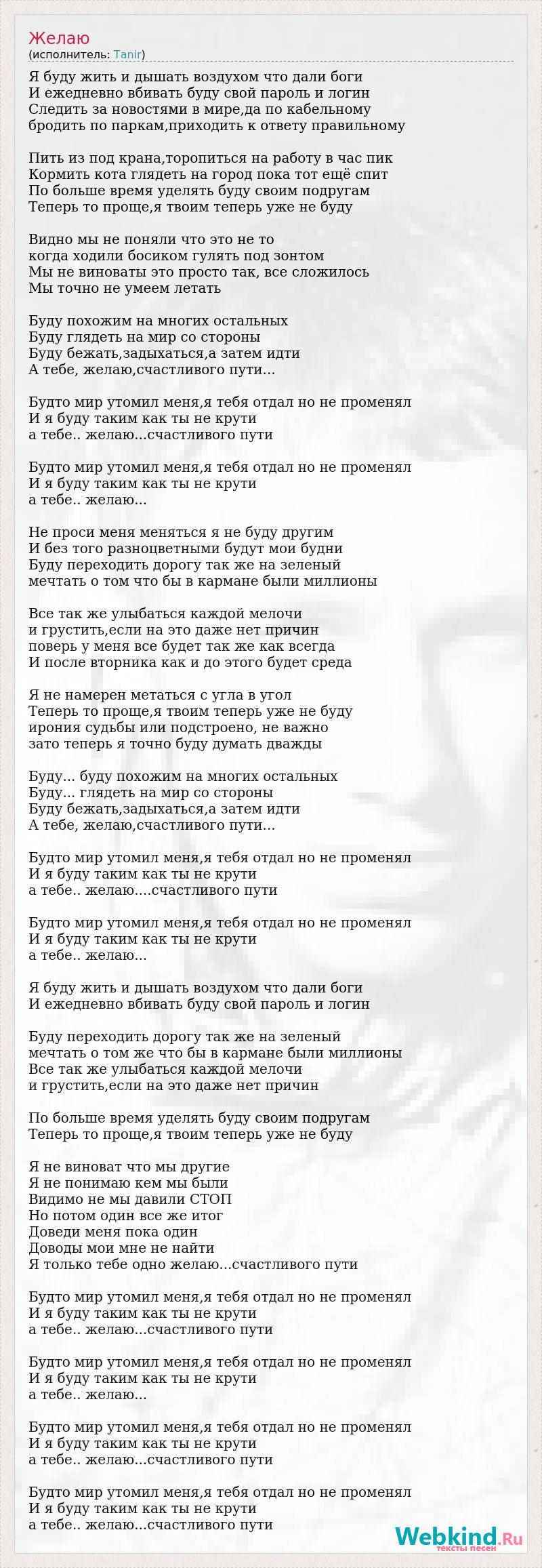 Я буду жить и дышать воздухом что дали боги И ежедневно вбивать буду свой пароль и логин Следить за новостями в мире,да по кабельному бродить по паркам,приходить к ответу правильному Пить из под крана,торопиться на работу в час пик Кормить кота глядеть на город пока тот ещё спит По больше время уделять буду своим подругам Теперь то проще,я твоим теперь уже не буду Видно мы не поняли что это не то когда ходили босиком гулять под зонтом Мы не виноваты это просто так, все сложилось Мы точно не умеем летать Буду похожим на многих остальных Буду глядеть на мир со стороны Буду бежать,задыхаться,а затем идти А тебе, желаю,счастливого пути... Будто мир утомил меня,я тебя отдал но не променял И я буду таким как ты не крути а тебе.. желаю...счастливого пути Будто мир утомил меня,я тебя отдал но не променял И я буду таким как ты не крути а тебе.. желаю... Не проси меня меняться я не буду другим И без того разноцветными будут мои будни Буду переходить дорогу так же на зеленый мечтать о том что бы в кармане были миллионы Все так же улыбаться каждой мелочи и грустить,если на это даже нет причин поверь у меня все будет так же как всегда И после вторника как и до этого будет среда Я не намерен метаться с угла в угол Теперь то проще,я твоим теперь уже не буду ирония судьбы или подстроено, не важно зато теперь я точно буду думать дважды Буду... буду похожим на многих остальных Буду... глядеть на мир со стороны Буду бежать,задыхаться,а затем идти А тебе, желаю,счастливого пути... Будто мир утомил меня,я тебя отдал но не променял И я буду таким как ты не крути а тебе.. желаю....счастливого пути Будто мир утомил меня,я тебя отдал но не променял И я буду таким как ты не крути а тебе.. желаю... Я буду жить и дышать воздухом что дали боги И ежедневно вбивать буду свой пароль и логин Буду переходить дорогу так же на зеленый мечтать о том же что бы в кармане были миллионы Все так же улыбаться каждой мелочи и грустить,если на это даже нет причин По больше время уделять буду своим подругам Теперь то проще,я твоим теперь уже не буду Я не виноват что мы другие Я не понимаю кем мы были Видимо не мы давили СТОП Но потом один все же итог Доведи меня пока один Доводы мои мне не найти Я только тебе одно желаю...счастливого пути Будто мир утомил меня,я тебя отдал но не променял И я буду таким как ты не крути а тебе.. желаю...счастливого пути Будто мир утомил меня,я тебя отдал но не променял И я буду таким как ты не крути а тебе.. желаю... Будто мир утомил меня,я тебя отдал но не променял И я буду таким как ты не крути а тебе.. желаю...счастливого пути Будто мир утомил меня,я тебя отдал но не променял И я буду таким как ты не крути а тебе.. желаю...счастливого пути