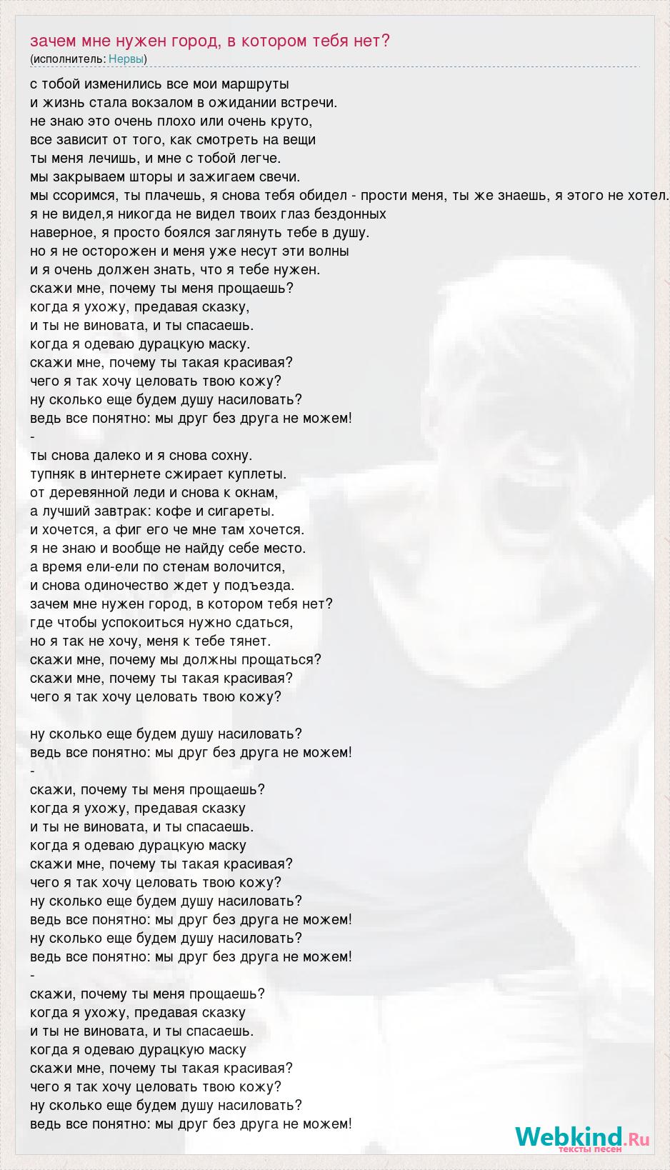 с тобой изменились все мои маршруты и жизнь стала вокзалом в ожидании встречи. не знаю это очень плохо или очень круто, все зависит от того, как смотреть на вещи ты меня лечишь, и мне с тобой легче. мы закрываем шторы и зажигаем свечи. мы ссоримся, ты плачешь, я снова тебя обидел - прости меня, ты же знаешь, я этого не хотел. я не видел,я никогда не видел твоих глаз бездонных наверное, я просто боялся заглянуть тебе в душу. но я не осторожен и меня уже несут эти волны и я очень должен знать, что я тебе нужен. скажи мне, почему ты меня прощаешь? когда я ухожу, предавая сказку, и ты не виновата, и ты спасаешь. когда я одеваю дурацкую маску. скажи мне, почему ты такая красивая? чего я так хочу целовать твою кожу? ну сколько еще будем душу насиловать? ведь все понятно: мы друг без друга не можем! - ты снова далеко и я снова сохну. тупняк в интернете сжирает куплеты. от деревянной леди и снова к окнам, а лучший завтрак: кофе и сигареты. и хочется, а фиг его че мне там хочется. я не знаю и вообще не найду себе место. а время ели-ели по стенам волочится, и снова одиночество ждет у подъезда. зачем мне нужен город, в котором тебя нет? где чтобы успокоиться нужно сдаться, но я так не хочу, меня к тебе тянет. скажи мне, почему мы должны прощаться? скажи мне, почему ты такая красивая? чего я так хочу целовать твою кожу? ну сколько еще будем душу насиловать? ведь все понятно: мы друг без друга не можем! - скажи, почему ты меня прощаешь? когда я ухожу, предавая сказку и ты не виновата, и ты спасаешь. когда я одеваю дурацкую маску скажи мне, почему ты такая красивая? чего я так хочу целовать твою кожу? ну сколько еще будем душу насиловать? ведь все понятно: мы друг без друга не можем! ну сколько еще будем душу насиловать? ведь все понятно: мы друг без друга не можем! - скажи, почему ты меня прощаешь? когда я ухожу, предавая сказку и ты не виновата, и ты спасаешь. когда я одеваю дурацкую маску скажи мне, почему ты такая красивая? чего я так хочу целовать твою кожу? ну сколько еще будем душу насиловать? ведь все понятно: мы друг без друга не можем!