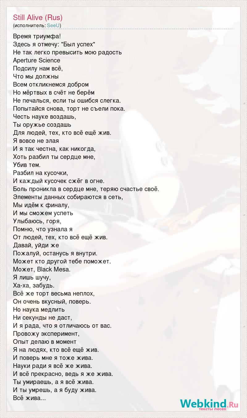 Время триумфа! Здесь я отмечу: "Был успех" Не так легко превысить мою радость Aperture Science Подсилу нам всё, Что мы должны Всем откликнемся добром Но мёртвых в счёт не берём Не печалься, если ты ошибся слегка. Попытайся снова, торт не съели пока. Честь науке воздашь, Ты оружье создашь Для людей, тех, кто всё ещё жив. Я вовсе не злая И я так честна, как никогда, Хоть разбил ты сердце мне, Убив тем. Разбил на кусочки, И каждый кусочек сжёг в огне. Боль проникла в сердце мне, теряю счастье своё. Элементы данных собираются в сеть, Мы идём к финалу, И мы сможем успеть Улыбаюсь, горя, Помню, что узнала я От людей, тех, кто всё ещё жив. Давай, уйди же Пожалуй, останусь я внутри. Может кто другой тебе поможет. Может, Black Mesa. Я лишь шучу, Ха-ха, забудь. Всё же торт весьма неплох, Он очень вкусный, поверь. Но наука медлить Ни секунды не даст, И я рада, что я отличаюсь от вас. Провожу эксперимент, Опыт делаю в момент Я на людях, кто всё ещё жив. И поверь мне я тоже жива. Науки ради я всё же жива. И всё прекрасно, ведь я же жива. Ты умираешь, а я всё жива. И ты умрешь, а я буду жива. Всё жива...