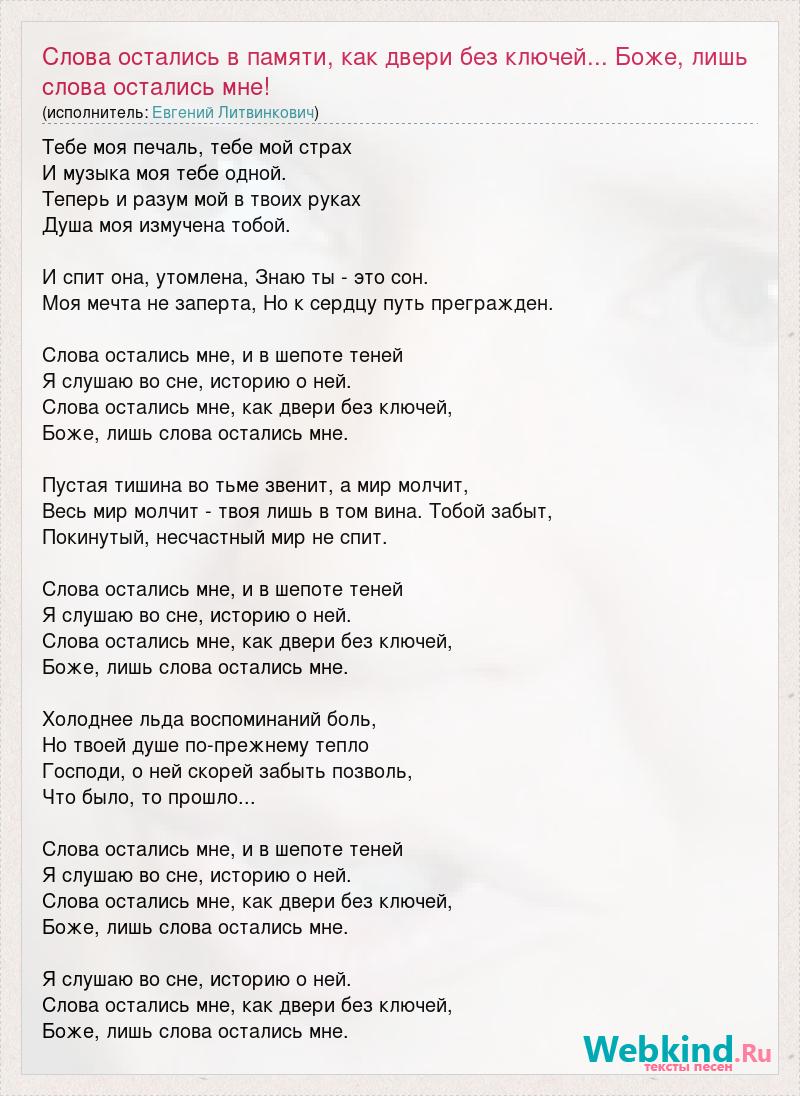 Главная→Исполнители→Евгений Литвинкович→Слова остались в памяти, как двери без ключей... Боже, лишь слова остались мне!