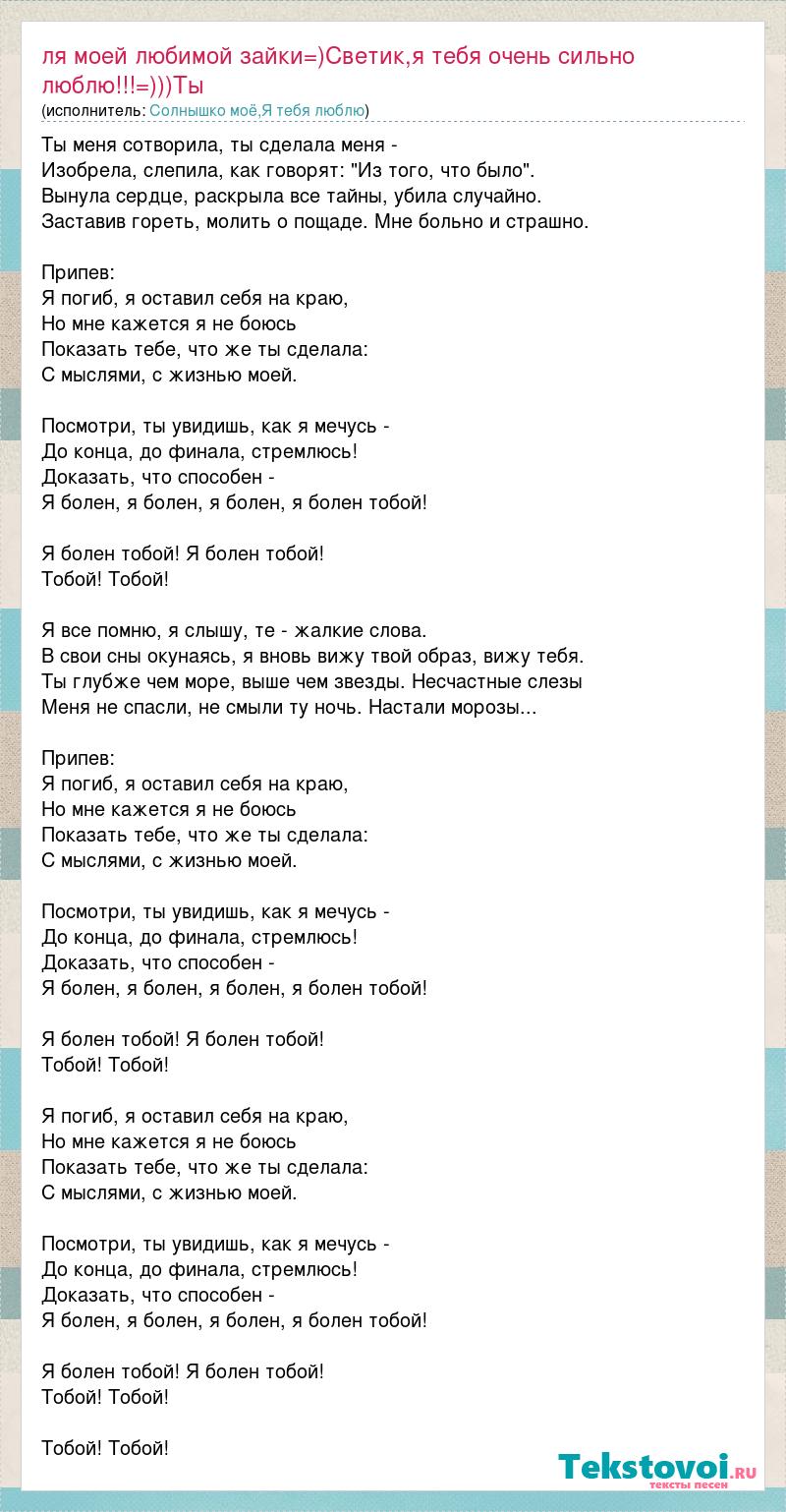 Ты меня сотворила, ты сделала меня - Изобрела, слепила, как говорят: "Из того, что было". Вынула сердце, раскрыла все тайны, убила случайно. Заставив гореть, молить о пощаде. Мне больно и страшно. Припев: Я погиб, я оставил себя на краю, Но мне кажется я не боюсь Показать тебе, что же ты сделала: С мыслями, с жизнью моей. Посмотри, ты увидишь, как я мечусь - До конца, до финала, стремлюсь! Доказать, что способен - Я болен, я болен, я болен, я болен тобой! Я болен тобой! Я болен тобой! Тобой! Тобой! Я все помню, я слышу, те - жалкие слова. В свои сны окунаясь, я вновь вижу твой образ, вижу тебя. Ты глубже чем море, выше чем звезды. Несчастные слезы Меня не спасли, не смыли ту ночь. Настали морозы... Припев: Я погиб, я оставил себя на краю, Но мне кажется я не боюсь Показать тебе, что же ты сделала: С мыслями, с жизнью моей. Посмотри, ты увидишь, как я мечусь - До конца, до финала, стремлюсь! Доказать, что способен - Я болен, я болен, я болен, я болен тобой! Я болен тобой! Я болен тобой! Тобой! Тобой! Я погиб, я оставил себя на краю, Но мне кажется я не боюсь Показать тебе, что же ты сделала: С мыслями, с жизнью моей. Посмотри, ты увидишь, как я мечусь - До конца, до финала, стремлюсь! Доказать, что способен - Я болен, я болен, я болен, я болен тобой! Я болен тобой! Я болен тобой! Тобой! Тобой! Тобой! Тобой!