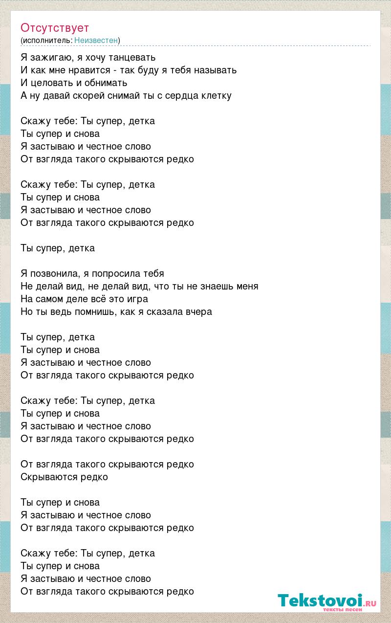 Я зажигаю, я хочу танцевать И как мне нравится - так буду я тебя называть И целовать и обнимать А ну давай скорей снимай ты с сердца клетку Скажу тебе: Ты супер, детка Ты супер и снова Я застываю и честное слово От взгляда такого скрываются редко Скажу тебе: Ты супер, детка Ты супер и снова Я застываю и честное слово От взгляда такого скрываются редко Ты супер, детка Я позвонила, я попросила тебя Не делай вид, не делай вид, что ты не знаешь меня На самом деле всё это игра Но ты ведь помнишь, как я сказала вчера Ты супер, детка Ты супер и снова Я застываю и честное слово От взгляда такого скрываются редко Скажу тебе: Ты супер, детка Ты супер и снова Я застываю и честное слово От взгляда такого скрываются редко От взгляда такого скрываются редко Скрываются редко Ты супер и снова Я застываю и честное слово От взгляда такого скрываются редко Скажу тебе: Ты супер, детка Ты супер и снова Я застываю и честное слово От взгляда такого скрываются редко