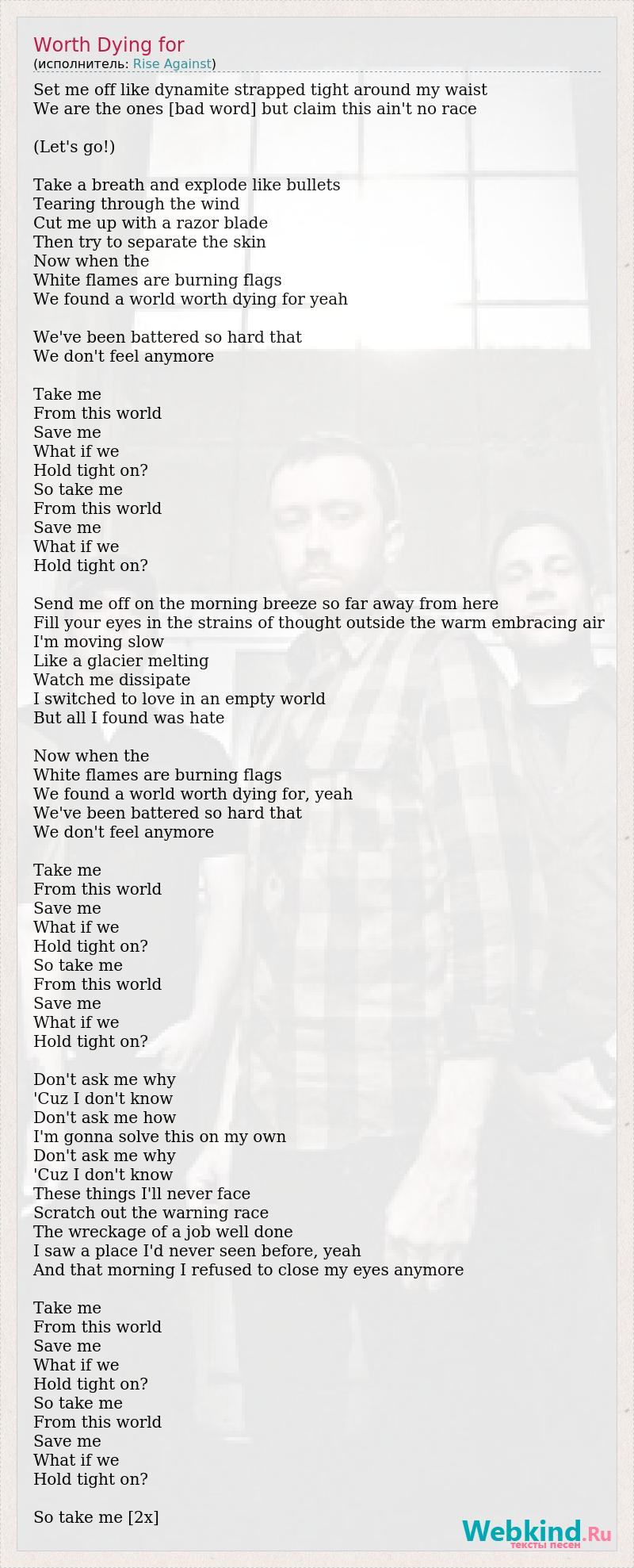 Set me off like dynamite strapped tight around my waist We are the ones [bad word] but claim this ain't no race (Let's go!) Take a breath and explode like bullets Tearing through the wind Cut me up with a razor blade Then try to separate the skin Now when the White flames are burning flags We found a world worth dying for yeah We've been battered so hard that We don't feel anymore Take me From this world Save me What if we Hold tight on? So take me From this world Save me What if we Hold tight on? Send me off on the morning breeze so far away from here Fill your eyes in the strains of thought outside the warm embracing air I'm moving slow Like a glacier melting Watch me dissipate I switched to love in an empty world But all I found was hate Now when the White flames are burning flags We found a world worth dying for, yeah We've been battered so hard that We don't feel anymore Take me From this world Save me What if we Hold tight on? So take me From this world Save me What if we Hold tight on? Don't ask me why 'Cuz I don't know Don't ask me how I'm gonna solve this on my own Don't ask me why 'Cuz I don't know These things I'll never face Scratch out the warning race The wreckage of a job well done I saw a place I'd never seen before, yeah And that morning I refused to close my eyes anymore Take me From this world Save me What if we Hold tight on? So take me From this world Save me What if we Hold tight on? So take me [2x]