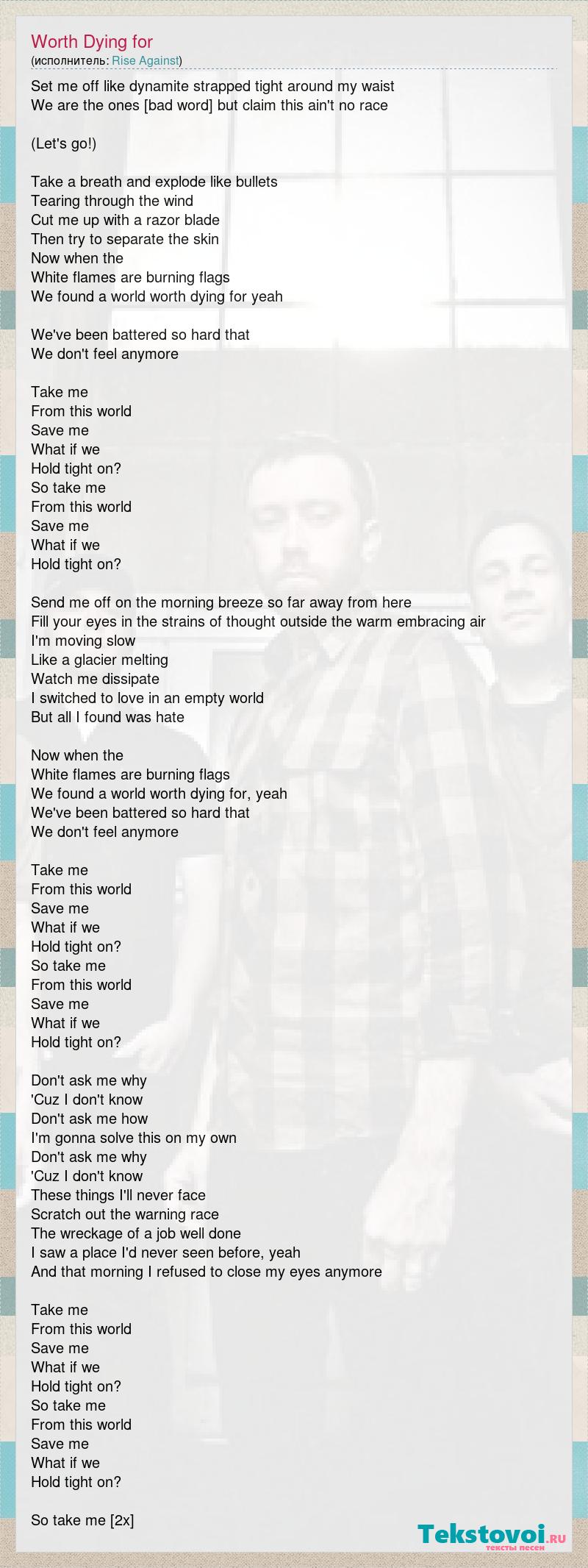 Set me off like dynamite strapped tight around my waist We are the ones [bad word] but claim this ain't no race (Let's go!) Take a breath and explode like bullets Tearing through the wind Cut me up with a razor blade Then try to separate the skin Now when the White flames are burning flags We found a world worth dying for yeah We've been battered so hard that We don't feel anymore Take me From this world Save me What if we Hold tight on? So take me From this world Save me What if we Hold tight on? Send me off on the morning breeze so far away from here Fill your eyes in the strains of thought outside the warm embracing air I'm moving slow Like a glacier melting Watch me dissipate I switched to love in an empty world But all I found was hate Now when the White flames are burning flags We found a world worth dying for, yeah We've been battered so hard that We don't feel anymore Take me From this world Save me What if we Hold tight on? So take me From this world Save me What if we Hold tight on? Don't ask me why 'Cuz I don't know Don't ask me how I'm gonna solve this on my own Don't ask me why 'Cuz I don't know These things I'll never face Scratch out the warning race The wreckage of a job well done I saw a place I'd never seen before, yeah And that morning I refused to close my eyes anymore Take me From this world Save me What if we Hold tight on? So take me From this world Save me What if we Hold tight on? So take me [2x]