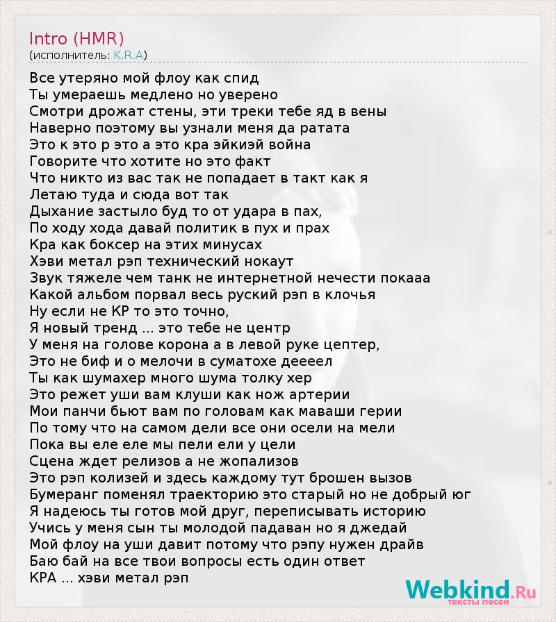Все утеряно мой флоу как спид Ты умераешь медлено но уверено Смотри дрожат стены, эти треки тебе яд в вены Наверно поэтому вы узнали меня да ратата Это к это р это а это кра эйкиэй война Говорите что хотите но это факт Что никто из вас так не попадает в такт как я Летаю туда и сюда вот так Дыхание застыло буд то от удара в пах, По ходу хода давай политик в пух и прах Кра как боксер на этих минусах Хэви метал рэп технический нокаут Звук тяжеле чем танк не интернетной нечести покааа Какой альбом порвал весь руский рэп в клочья Ну если не КР то это точно, Я новый тренд ... это тебе не центр У меня на голове корона а в левой руке цептер, Это не биф и о мелочи в суматохе деееел Ты как шумахер много шума толку хер Это режет уши вам клуши как нож артерии Мои панчи бьют вам по головам как маваши герии По тому что на самом дели все они осели на мели Пока вы еле еле мы пели ели у цели Сцена ждет релизов а не жопализов Это рэп колизей и здесь каждому тут брошен вызов Бумеранг поменял траекторию это старый но не добрый юг Я надеюсь ты готов мой друг, переписывать историю Учись у меня сын ты молодой падаван но я джедай Мой флоу на уши давит потому что рэпу нужен драйв Баю бай на все твои вопросы есть один ответ КРА ... хэви метал рэп