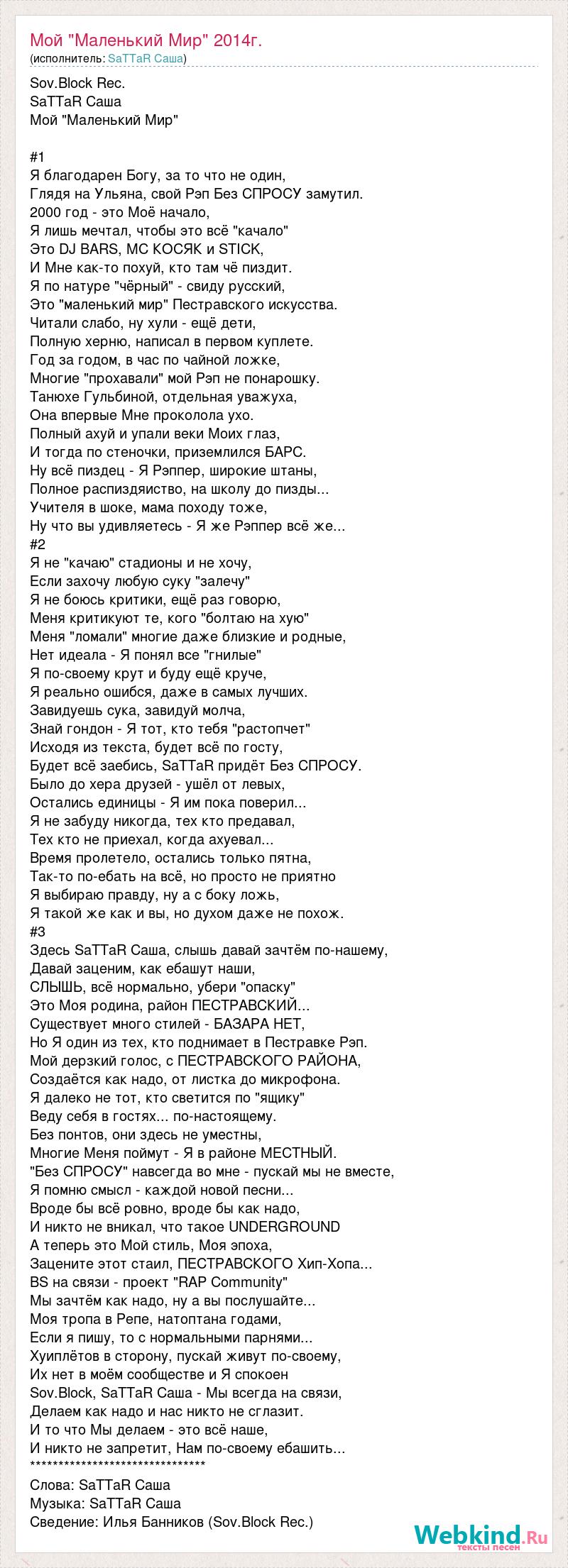 Sov.Block Rec. SaTTaR Саша Мой "Маленький Мир" #1 Я благодарен Богу, за то что не один, Глядя на Ульяна, свой Рэп Без СПРОСУ замутил. 2000 год - это Моё начало, Я лишь мечтал, чтобы это всё "качало" Это DJ BARS, MC КОСЯК и STICK, И Мне как-то похуй, кто там чё пиздит. Я по натуре "чёрный" - свиду русский, Это "маленький мир" Пестравского искусства. Читали слабо, ну хули - ещё дети, Полную херню, написал в первом куплете. Год за годом, в час по чайной ложке, Многие "прохавали" мой Рэп не понарошку. Танюхе Гульбиной, отдельная уважуха, Она впервые Мне проколола ухо. Полный ахуй и упали веки Моих глаз, И тогда по стеночки, приземлился БАРС. Ну всё пиздец - Я Рэппер, широкие штаны, Полное распиздяиство, на школу до пизды... Учителя в шоке, мама походу тоже, Ну что вы удивляетесь - Я же Рэппер всё же... #2 Я не "качаю" стадионы и не хочу, Если захочу любую суку "залечу" Я не боюсь критики, ещё раз говорю, Меня критикуют те, кого "болтаю на хую" Меня "ломали" многие даже близкие и родные, Нет идеала - Я понял все "гнилые" Я по-своему крут и буду ещё круче, Я реально ошибся, даже в самых лучших. Завидуешь сука, завидуй молча, Знай гондон - Я тот, кто тебя "растопчет" Исходя из текста, будет всё по госту, Будет всё заебись, SaTTaR придёт Без СПРОСУ. Было до хера друзей - ушёл от левых, Остались единицы - Я им пока поверил... Я не забуду никогда, тех кто предавал, Тех кто не приехал, когда ахуевал... Время пролетело, остались только пятна, Так-то по-ебать на всё, но просто не приятно Я выбираю правду, ну а с боку ложь, Я такой же как и вы, но духом даже не похож. #3 Здесь SaTTaR Саша, слышь давай зачтём по-нашему, Давай заценим, как ебашут наши, СЛЫШЬ, всё нормально, убери "опаску" Это Моя родина, район ПЕСТРАВСКИЙ... Существует много стилей - БАЗАРА НЕТ, Но Я один из тех, кто поднимает в Пестравке Рэп. Мой дерзкий голос, с ПЕСТРАВСКОГО РАЙОНА, Создаётся как надо, от листка до микрофона. Я далеко не тот, кто светится по "ящику" Веду себя в гостях... по-настоящему. Без понтов, они здесь не уместны, Многие Меня поймут - Я в районе МЕСТНЫЙ. "Без СПРОСУ" навсегда во мне - пускай мы не вместе, Я помню смысл - каждой новой песни... Вроде бы всё ровно, вроде бы как надо, И никто не вникал, что такое UNDERGROUND А теперь это Мой стиль, Моя эпоха, Зацените этот стаил, ПЕСТРАВСКОГО Хип-Хопа... BS на связи - проект "RAP Community" Мы зачтём как надо, ну а вы послушайте... Моя тропа в Репе, натоптана годами, Если я пишу, то с нормальными парнями... Хуиплётов в сторону, пускай живут по-своему, Их нет в моём сообществе и Я спокоен Sov.Block, SaTTaR Саша - Мы всегда на связи, Делаем как надо и нас никто не сглазит. И то что Мы делаем - это всё наше, И никто не запретит, Нам по-своему ебашить... ******************************* Слова: SaTTaR Саша Музыка: SaTTaR Саша Сведение: Илья Банников (Sov.Block Rec.)