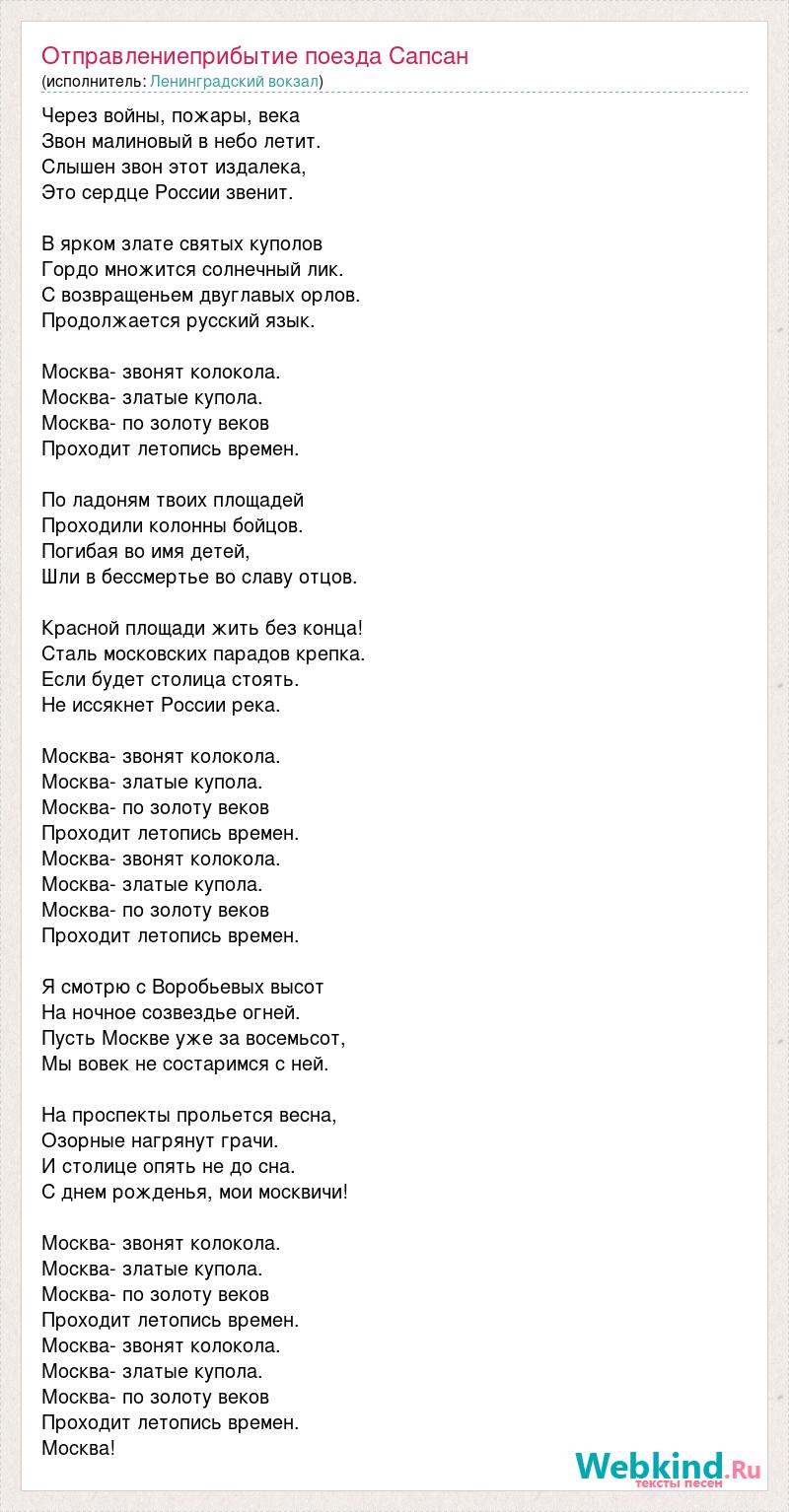 Через войны, пожары, века Звон малиновый в небо летит. Слышен звон этот издалека, Это сердце России звенит. В ярком злате святых куполов Гордо множится солнечный лик. С возвращеньем двуглавых орлов. Продолжается русский язык. Москва- звонят колокола. Москва- златые купола. Москва- по золоту веков Проходит летопись времен. По ладоням твоих площадей Проходили колонны бойцов. Погибая во имя детей, Шли в бессмертье во славу отцов. Красной площади жить без конца! Сталь московских парадов крепка. Если будет столица стоять. Не иссякнет России река. Москва- звонят колокола. Москва- златые купола. Москва- по золоту веков Проходит летопись времен. Москва- звонят колокола. Москва- златые купола. Москва- по золоту веков Проходит летопись времен. Я смотрю с Воробьевых высот На ночное созвездье огней. Пусть Москве уже за восемьсот, Мы вовек не состаримся с ней. На проспекты прольется весна, Озорные нагрянут грачи. И столице опять не до сна. С днем рожденья, мои москвичи! Москва- звонят колокола. Москва- златые купола. Москва- по золоту веков Проходит летопись времен. Москва- звонят колокола. Москва- златые купола. Москва- по золоту веков Проходит летопись времен. Москва!