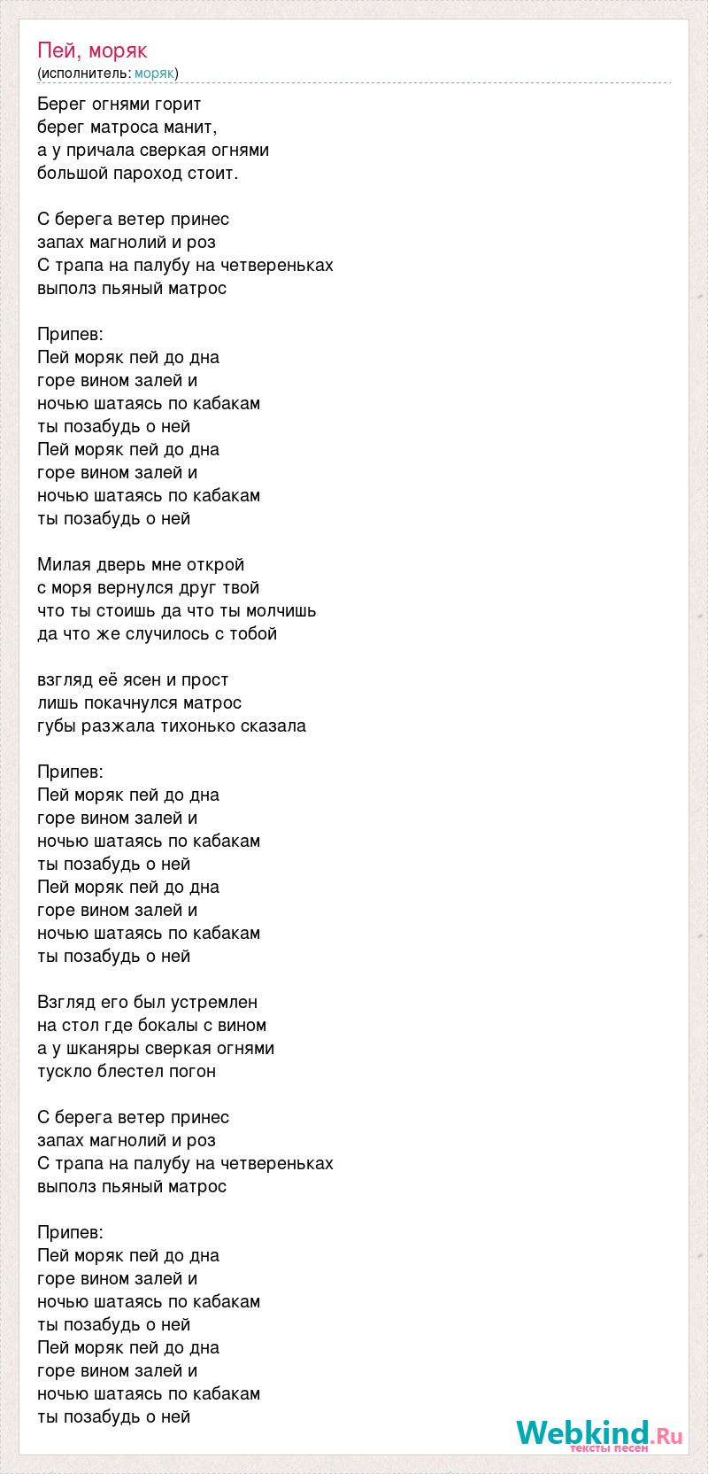 Берег огнями горит берег матроса манит, а у причала сверкая огнями большой пароход стоит. С берега ветер принес запах магнолий и роз С трапа на палубу на четвереньках выполз пьяный матрос Припев: Пей моряк пей до дна горе вином залей и ночью шатаясь по кабакам ты позабудь о ней Пей моряк пей до дна горе вином залей и ночью шатаясь по кабакам ты позабудь о ней Милая дверь мне открой с моря вернулся друг твой что ты стоишь да что ты молчишь да что же случилось с тобой взгляд её ясен и прост лишь покачнулся матрос губы разжала тихонько сказала Припев: Пей моряк пей до дна горе вином залей и ночью шатаясь по кабакам ты позабудь о ней Пей моряк пей до дна горе вином залей и ночью шатаясь по кабакам ты позабудь о ней Взгляд его был устремлен на стол где бокалы с вином а у шканяры сверкая огнями тускло блестел погон С берега ветер принес запах магнолий и роз С трапа на палубу на четвереньках выполз пьяный матрос Припев: Пей моряк пей до дна горе вином залей и ночью шатаясь по кабакам ты позабудь о ней Пей моряк пей до дна горе вином залей и ночью шатаясь по кабакам ты позабудь о ней