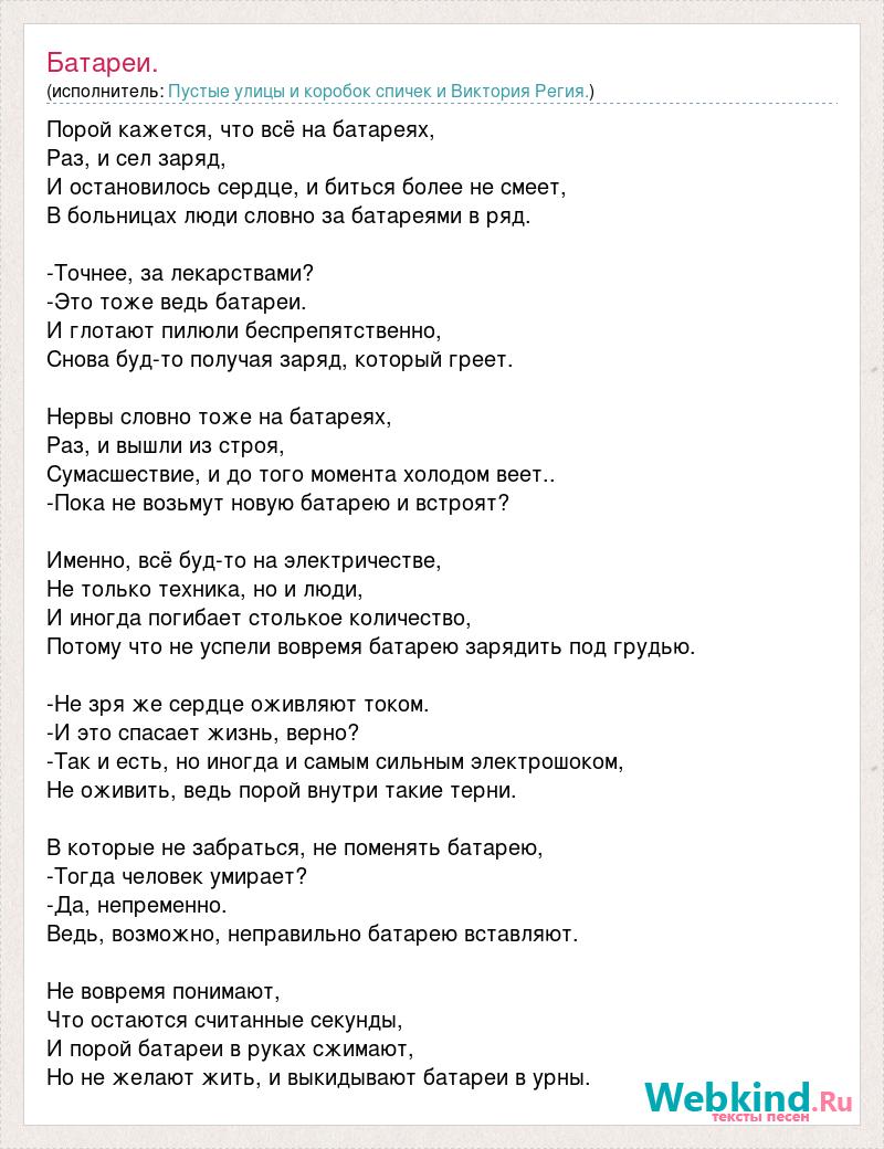 Порой кажется, что всё на батареях, Раз, и сел заряд, И остановилось сердце, и биться более не смеет, В больницах люди словно за батареями в ряд. -Точнее, за лекарствами? -Это тоже ведь батареи. И глотают пилюли беспрепятственно, Снова буд-то получая заряд, который греет. Нервы словно тоже на батареях, Раз, и вышли из строя, Сумасшествие, и до того момента холодом веет.. -Пока не возьмут новую батарею и встроят? Именно, всё буд-то на электричестве, Не только техника, но и люди, И иногда погибает столькое количество, Потому что не успели вовремя батарею зарядить под грудью. -Не зря же сердце оживляют током. -И это спасает жизнь, верно? -Так и есть, но иногда и самым сильным электрошоком, Не оживить, ведь порой внутри такие терни. В которые не забраться, не поменять батарею, -Тогда человек умирает? -Да, непременно. Ведь, возможно, неправильно батарею вставляют. Не вовремя понимают, Что остаются считанные секунды, И порой батареи в руках сжимают, Но не желают жить, и выкидывают батареи в урны.