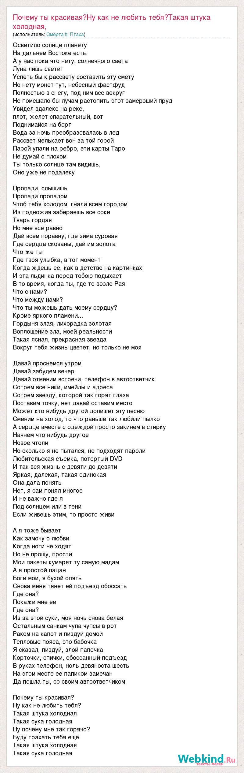 Почему ты красивая?Ну как не любить тебя?Такая штука холодная, Такая сука голодн