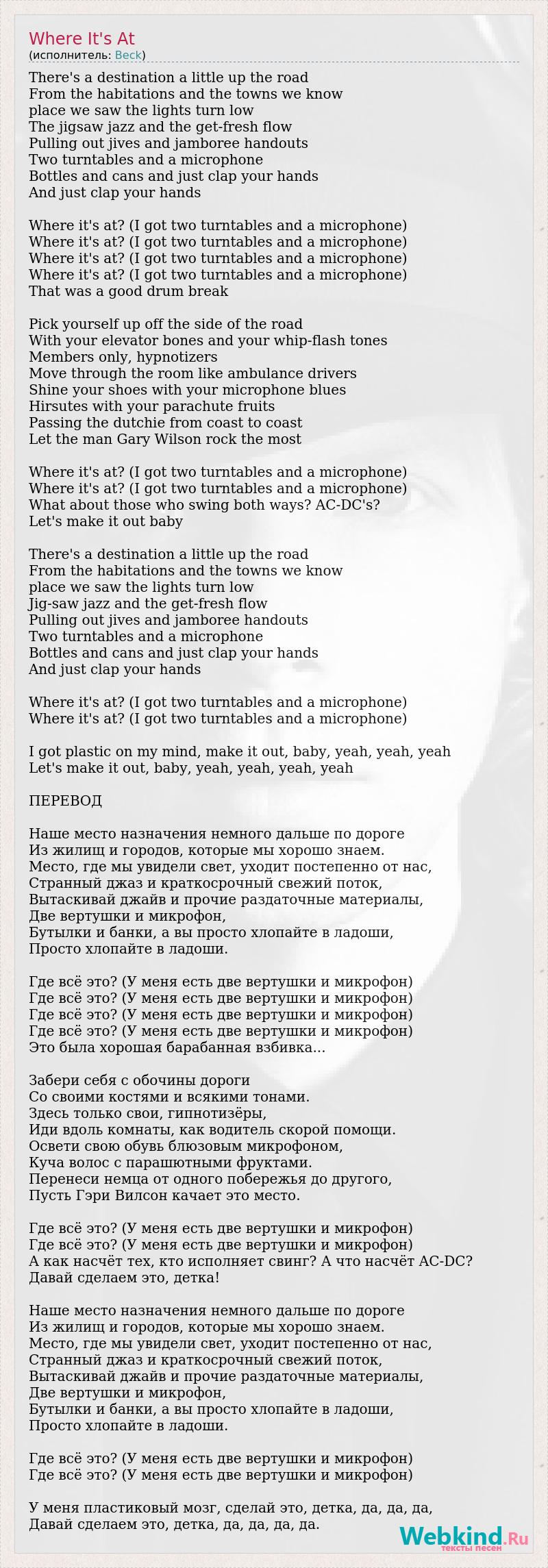 There's a destination a little up the road From the habitations and the towns we know place we saw the lights turn low The jigsaw jazz and the get-fresh flow Pulling out jives and jamboree handouts Two turntables and a microphone Bottles and cans and just clap your hands And just clap your hands Where it's at? (I got two turntables and a microphone) Where it's at? (I got two turntables and a microphone) Where it's at? (I got two turntables and a microphone) Where it's at? (I got two turntables and a microphone) That was a good drum break Pick yourself up off the side of the road With your elevator bones and your whip-flash tones Members only, hypnotizers Move through the room like ambulance drivers Shine your shoes with your microphone blues Hirsutes with your parachute fruits Passing the dutchie from coast to coast Let the man Gary Wilson rock the most Where it's at? (I got two turntables and a microphone) Where it's at? (I got two turntables and a microphone) What about those who swing both ways? AC-DC's? Let's make it out baby There's a destination a little up the road From the habitations and the towns we know place we saw the lights turn low Jig-saw jazz and the get-fresh flow Pulling out jives and jamboree handouts Two turntables and a microphone Bottles and cans and just clap your hands And just clap your hands Where it's at? (I got two turntables and a microphone) Where it's at? (I got two turntables and a microphone) I got plastic on my mind, make it out, baby, yeah, yeah, yeah Let's make it out, baby, yeah, yeah, yeah, yeah ПЕРЕВОД Наше место назначения немного дальше по дороге Из жилищ и городов, которые мы хорошо знаем. Место, где мы увидели свет, уходит постепенно от нас, Странный джаз и краткосрочный свежий поток, Вытаскивай джайв и прочие раздаточные материалы, Две вертушки и микрофон, Бутылки и банки, а вы просто хлопайте в ладоши, Просто хлопайте в ладоши. Где всё это? (У меня есть две вертушки и микрофон) Где всё это? (У меня есть две вертушки и микрофон) Где всё это? (У меня есть две вертушки и микрофон) Где всё это? (У меня есть две вертушки и микрофон) Это была хорошая барабанная взбивка... Забери себя с обочины дороги Со своими костями и всякими тонами. Здесь только свои, гипнотизёры, Иди вдоль комнаты, как водитель скорой помощи. Освети свою обувь блюзовым микрофоном, Куча волос с парашютными фруктами. Перенеси немца от одного побережья до другого, Пусть Гэри Вилсон качает это место. Где всё это? (У меня есть две вертушки и микрофон) Где всё это? (У меня есть две вертушки и микрофон) А как насчёт тех, кто исполняет свинг? А что насчёт AC-DC? Давай сделаем это, детка! Наше место назначения немного дальше по дороге Из жилищ и городов, которые мы хорошо знаем. Место, где мы увидели свет, уходит постепенно от нас, Странный джаз и краткосрочный свежий поток, Вытаскивай джайв и прочие раздаточные материалы, Две вертушки и микрофон, Бутылки и банки, а вы просто хлопайте в ладоши, Просто хлопайте в ладоши. Где всё это? (У меня есть две вертушки и микрофон) Где всё это? (У меня есть две вертушки и микрофон) У меня пластиковый мозг, сделай это, детка, да, да, да, Давай сделаем это, детка, да, да, да, да.