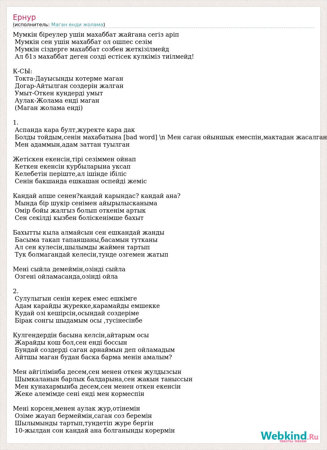 Мумкiн бiреулер ушiн махаббат жайгана сегiз арiп Мумкiн сен ушiн махаббат ол ошпес сезiм Мумкiн сiздерге махаббат созбен жеткiзiлмейд Ал б1з махаббат деген создi естiсек кулкiмiз тиiлмейд! К-СЫ: Токта-Дауысынды котерме маган Догар-Айтылган создерiн жалган Умыт-Откен кундердi умыт Аулак-Жолама ендi маган (Маган жолама ендi) 1. Аспанда кара булт,журекте кара дак Болды тойдым,сенiн махабатына [bad word] \n Мен саган ойыншык емеспiн,мактадан жасалган Мен адаммын,адам заттан туылган Жетiскен екенсiн,тiрi сезiммен ойнап Кеткен екенсiн курбыларына уксап Келебетiн перiште,ал iшiнде iбiлiс Сенiн бакшанда ешкашан оспейдi жемiс Кандай апше сенен?кандай карындас? кандай ана? Мында бiр шукiр сенiмен айырылысканыма Омiр бойы жалгыз болып откенiм артык Сен секiлдi кызбен болiскенiмше бахыт Бахытты кыла алмайсын сен ешкандай жанды Басыма такап тапаншаны,басамын тутканы Ал сен кулесiн,шылымды жаймен тартып Тук болмагандай келесiн,тунде озгемен жатып Менi сыйла демеймiн,озiндi сыйла Озгенi ойламасанда,озiндi ойла 2. Сулулыгын сенiн керек емес ешкiмге Адам карайды журекке,карамайды емшекке Кудай озi кешiрсiн,осындай создерiме Бiрак сонгы шыдамым осы ,тусiнесiнбе Кулгендердiн басына келсiн,айтарым осы Жарайды кош бол,сен ендi боссын Бундай создердi саган арнаймын деп ойламадым Айтшы маган будан баска барма менiн амалым? Мен айгiлiмiнба десем,сен менен откен жулдызсын Шымкаланын барлык балдарына,сен жакын таныссын Мен кунахармынба десем,сен менен откен екенсiн Жеке алемiмде сенi ендi мен кормеспiн Менi корсен,менен аулак жур,отiнемiн Озiме жауап бермеймiн,саган соз беремiн Шылымынды тартып,тундетiп журе бергiн 10-жылдан сон кандай ана болганынды корермiн
