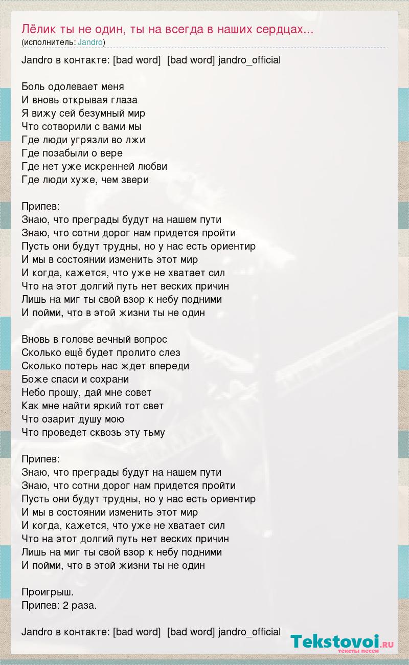 Jandro в контакте: [bad word] [bad word] jandro_official Боль одолевает меня И вновь открывая глаза Я вижу сей безумный мир Что сотворили с вами мы Где люди угрязли во лжи Где позабыли о вере Где нет уже искренней любви Где люди хуже, чем звери Припев: Знаю, что преграды будут на нашем пути Знаю, что сотни дорог нам придется пройти Пусть они будут трудны, но у нас есть ориентир И мы в состоянии изменить этот мир И когда, кажется, что уже не хватает сил Что на этот долгий путь нет веских причин Лишь на миг ты свой взор к небу подними И пойми, что в этой жизни ты не один Вновь в голове вечный вопрос Сколько ещё будет пролито слез Сколько потерь нас ждет впереди Боже спаси и сохрани Небо прошу, дай мне совет Как мне найти яркий тот свет Что озарит душу мою Что проведет сквозь эту тьму Припев: Знаю, что преграды будут на нашем пути Знаю, что сотни дорог нам придется пройти Пусть они будут трудны, но у нас есть ориентир И мы в состоянии изменить этот мир И когда, кажется, что уже не хватает сил Что на этот долгий путь нет веских причин Лишь на миг ты свой взор к небу подними И пойми, что в этой жизни ты не один Проигрыш. Припев: 2 раза. Jandro в контакте: [bad word] [bad word] jandro_official