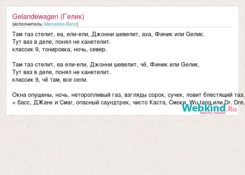 Там таз стелит, еа, ели-ели, Джонни шевелит, аха, Финик или Gелик. Тут ваз в деле, понял не канетелит. классик 9, тонировка, ночь, север. Там таз стелит, еа ели-ели, Джонни шевелит, чё, Финик или Gелик. Тут ваз в деле, понял не канетелит. классик 9, чё там, все сели. Окна опущены, ночь, неторопливый газ, взгляды сорок, сучек, ловит блестящий таз. + басс, ДЖанк и Смаr, опасный саундтрек, чисто Каста, Смоки, Wu tang или Dr. Dre.