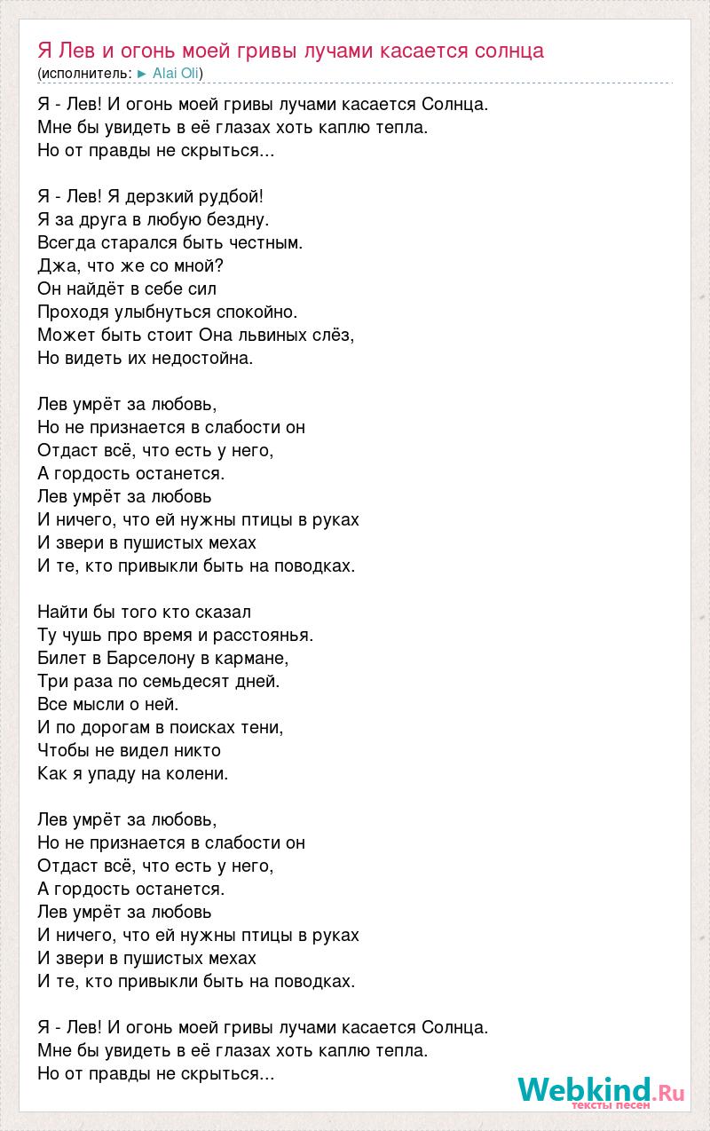 Я - Лев! И огонь моей гривы лучами касается Солнца. Мне бы увидеть в её глазах хоть каплю тепла. Но от правды не скрыться... Я - Лев! Я дерзкий рудбой! Я за друга в любую бездну. Всегда старался быть честным. Джа, что же со мной? Он найдёт в себе сил Проходя улыбнуться спокойно. Может быть стоит Она львиных слёз, Но видеть их недостойна. Лев умрёт за любовь, Но не признается в слабости он Отдаст всё, что есть у него, А гордость останется. Лев умрёт за любовь И ничего, что ей нужны птицы в руках И звери в пушистых мехах И те, кто привыкли быть на поводках. Найти бы того кто сказал Ту чушь про время и расстоянья. Билет в Барселону в кармане, Три раза по семьдесят дней. Все мысли о ней. И по дорогам в поисках тени, Чтобы не видел никто Как я упаду на колени. Лев умрёт за любовь, Но не признается в слабости он Отдаст всё, что есть у него, А гордость останется. Лев умрёт за любовь И ничего, что ей нужны птицы в руках И звери в пушистых мехах И те, кто привыкли быть на поводках. Я - Лев! И огонь моей гривы лучами касается Солнца. Мне бы увидеть в её глазах хоть каплю тепла. Но от правды не скрыться...