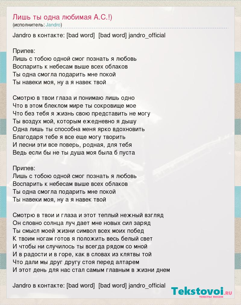 Jandro в контакте: [bad word] [bad word] jandro_official Припев: Лишь с тобою одной смог познать я любовь Воспарить к небесам выше всех облаков Ты одна смогла подарить мне покой Ты навеки моя, ну а я навек твой Смотрю в твои глаза и понимаю лишь одно Что в этом блеклом мире ты сокровище мое Что без тебя я жизнь свою представить не могу Ты воздух мой, которым ежедневно я дышу Одна лишь ты способна меня ярко вдохновить Благодаря тебе я все еще могу творить И песни эти все поверь, родная, для тебя Ведь если бы не ты душа моя была б пуста Припев: Лишь с тобою одной смог познать я любовь Воспарить к небесам выше всех облаков Ты одна смогла подарить мне покой Ты навеки моя, ну а я навек твой Смотрю в твои и глаза и этот теплый нежный взгляд Он словно солнца луч дает мне новых сил заряд Ты смысл моей жизни символ всех моих побед К твоим ногам готов я положить весь белый свет И чтобы ни случилось ты всегда рядом со мной И в радости и в горе, как в словах из клятвы той Что дали мы друг другу стоя перед алтарем И этот день для нас стал самым главным в жизни днем Jandro в контакте: [bad word] [bad word] jandro_official