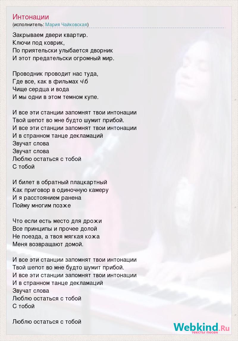 Закрываем двери квартир. Ключи под коврик, По приятельски улыбается дворник И этот предательски огромный мир. Проводник проводит нас туда, Где все, как в фильмах ч\б Чище сердца и вода И мы одни в этом темном купе. И все эти станции запомнят твои интонации Твой шепот во мне будто шумит прибой. И все эти станции запомнят твои интонации И в странном танце декламаций Звучат слова Звучат слова Люблю остаться с тобой С тобой И билет в обратный плацкартный Как приговор в одиночную камеру И я расстоянием ранена Пойму многим позже Что если есть место для дрожи Все принципы и прочее долой Не поезда, а твоя мягкая кожа Меня возвращают домой. И все эти станции запомнят твои интонации Твой шепот во мне будто шумит прибой. И все эти станции запомнят твои интонации И в странном танце декламаций Звучат слова Люблю остаться с тобой С тобой Люблю остаться с тобой