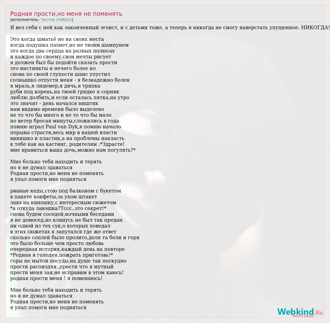 Я вел себя с ней как законченный эгоист, и с детьми тоже. а теперь я никогда не смогу наверстать упущенное. НИКОГДА! Это когда шматьё не на своих места когда подушка пахнет,но не твоим шампунем это когда два сердца на разных полюсах и каждое по своему,свои мечты рисует я должен был бы подойти сказать прости это инстинкты и нечего более но снова по своей глупости шанс упустил солнышко отпусти меня - я безнадежно болен я мразь,я лицемер,я дичь,я тряпка руби под корень,на твоей грядке я сорняк люблю долбить,и если осталась пятка,на утро это значит - день начался ништяк нам видимо времени было выделено не то что бы много и не то что бы мало но ветер бросая минуты,сложились в года помню играл Paul van Dyk,я помню начало порывы страсти,весь мир в нашей власти винишко и пластик,а на проблемы накласть к тебе как на кастинг, родителям :*Здрасте! мне нравиться ваша дочь,можно нам погулять?* Мне больно тебя находить и терять но я не думал здаваться Родная прости,но меня не поменять я упал помоги мне подняться рваные кеды,стою под балконом с букетом в пакете конфеты,за ухом штакет лавэ на киношку,с интересным сюжетом *а откуда лавэшка?Тссс..это секрет!* снова будем соседей,ночными беседами я не домосед,но клянусь не был так предан ни одной из тех сук,о которых поведал в этих сюжетах я запутался где же ответ сколько соплей было пролито,доля та боли и горя это было больше чем просто любовь очередная история,каждый день на повторе *Родная я голоден,пожрать приготовь!* горы не мытой посуды,на душе так поскудно прости распиздяя ,прости что я мутный прости меня зая,не исправим в этом каюсь! родная прости меня ! я поменяюсь! Мне больно тебя находить и терять но я не думал здаваться Родная прости,но меня не поменять я упал помоги мне подняться