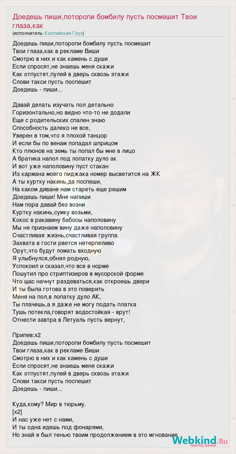 Доедешь пиши,поторопи бомбилу пусть посмешит Твои глаза,как в рекламе Виши Смотрю в них и как камень с души Если спросят,не знаешь меня скажи Как отпустят,пулей в дверь сквозь этажи Слови такси пусть поспешит Доедешь - пиши... Давай делать изучать пол детально Горизонтально,но видно что-то не додали Еще с родительских спален знаю Способность далеко не все, Уверен в том,что я плохой танцор И если бы по венам попадал шприцом Кто плюнов на земь ты попал бы мне в лицо А братика напол под лопатку дуло ак И вот уже наполовину пуст стакан Из кармана моего пиджака номер высветится на ЖК А ты куртку накинь,да поспеши, На каком диване нам стареть еще решим Доедешь пиши! Мне напиши Нам пора давай без возни Куртку накинь,сумку возьми, Кокос в ракавину бабосы наполовину Мы не признаем вину даже наполовину Счастливая жизнь,счастливая группа Захвата в гости рвется нетерпеливо Орут,что будут ломать входную Я улыбнулся,обнял родную, Успокоил и сказал,что все в норме Пошутил про стриптизеров в мусорской форме Что щас начнут раздеваться,как откроешь двери И ты была готова в это поверить Меня на пол,в лопатку дуло АК, Ты плачешь,а я даже не могу подать платка Тушь потекла,говорят водостойкая - врут! Отнести завтра в Летуаль пусть вернут, Припев:х2 Доедешь пиши,поторопи бомбилу пусть посмешит Твои глаза,как в рекламе Виши Смотрю в них и как камень с души Если спросят,не знаешь меня скажи Как отпустят,пулей в дверь сквозь этажи Слови такси пусть поспешит Доедешь - пиши... Куда,кому? Мир в тюрьму. [х2] И нас уже нет с нами, И ты одна идешь под фонарями, Но знай я был тенью твоим продолжением в это мгнование