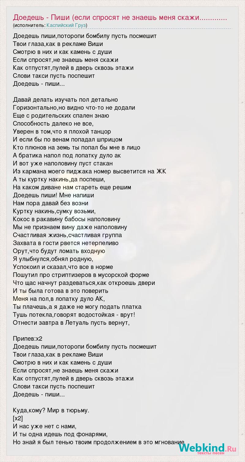 Доедешь пиши,поторопи бомбилу пусть посмешит Твои глаза,как в рекламе Виши Смотрю в них и как камень с души Если спросят,не знаешь меня скажи Как отпустят,пулей в дверь сквозь этажи Слови такси пусть поспешит Доедешь - пиши... Давай делать изучать пол детально Горизонтально,но видно что-то не додали Еще с родительских спален знаю Способность далеко не все, Уверен в том,что я плохой танцор И если бы по венам попадал шприцом Кто плюнов на земь ты попал бы мне в лицо А братика напол под лопатку дуло ак И вот уже наполовину пуст стакан Из кармана моего пиджака номер высветится на ЖК А ты куртку накинь,да поспеши, На каком диване нам стареть еще решим Доедешь пиши! Мне напиши Нам пора давай без возни Куртку накинь,сумку возьми, Кокос в ракавину бабосы наполовину Мы не признаем вину даже наполовину Счастливая жизнь,счастливая группа Захвата в гости рвется нетерпеливо Орут,что будут ломать входную Я улыбнулся,обнял родную, Успокоил и сказал,что все в норме Пошутил про стриптизеров в мусорской форме Что щас начнут раздеваться,как откроешь двери И ты была готова в это поверить Меня на пол,в лопатку дуло АК, Ты плачешь,а я даже не могу подать платка Тушь потекла,говорят водостойкая - врут! Отнести завтра в Летуаль пусть вернут, Припев:х2 Доедешь пиши,поторопи бомбилу пусть посмешит Твои глаза,как в рекламе Виши Смотрю в них и как камень с души Если спросят,не знаешь меня скажи Как отпустят,пулей в дверь сквозь этажи Слови такси пусть поспешит Доедешь - пиши... Куда,кому? Мир в тюрьму. [х2] И нас уже нет с нами, И ты одна идешь под фонарями, Но знай я был тенью твоим продолжением в это мгнование
