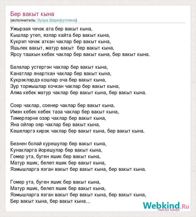 Умырзая чэчэк ата бер вакыт кына, Кышлар утеп, язлар кайта бер вакыт кына, Кукрэп чэчэк аткан чаклар бер вакыт кына, Яшьлек вакыт, матур вакыт бер вакыт кына, Ярсу ташкын кебек чаклар бер вакыт кына, бер вакыт кына. Балалар устергэн чаклар бер вакыт кына, Канатлар янарткан чаклар бер вакыт кына, Кукрэклэрдэ кошлар оча бер вакыт кына, Зур тормышлар кочкан чаклар бер вакыт кына, Алма кебек матур чаклар бер вакыт кына, бер вакыт кына. Соер чаклар, соенер чаклар бер вакыт кына, Имэн кебек кебек таза чаклар бер вакыт кына, Тимерлэрне озэр чаклар бер вакыт кына, Яна ойлэр ояр чаклар бер вакыт кына, Кешелэргэ кирэк чаклар бер вакыт кына, бер вакыт кына. Безнен болай курешулэр бер вакыт кына, Кунакларга йорешулэр бер вакыт кына, Гомер утэ, буген яшик бер вакыт кына, Матур яшик, белеп яшик бер вакыт кына, Язмышларга язган вакыт бер вакыт кына, бер вакыт кына. Гомер утэ, буген яшик бер вакыт кына, Матур яшик, белеп яшик бер вакыт кына, Язмышларга язган вакыт бер вакыт кына, бер вакыт кына, Бер вакыт кына, бер вакыт кына…