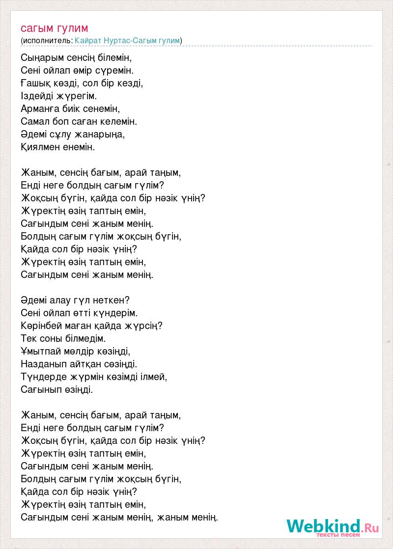 Сыңарым сенсің білемін, Сені ойлап өмір сүремін. Ғашық көзді, сол бір кезді, Іздейді жүрегім. Арманға биік сенемін, Самал боп саған келемін. Әдемі сұлу жанарыңа, Қиялмен енемін. Жаным, сенсің бағым, арай таңым, Енді неге болдың сағым гүлім? Жоқсың бүгін, қайда сол бір нәзік үнің? Жүректің өзің таптың емін, Сағындым сені жаным менің. Болдың сағым гүлім жоқсың бүгін, Қайда сол бір нәзік үнің? Жүректің өзің таптың емін, Сағындым сені жаным менің. Әдемі алау гүл неткен? Сені ойлап өтті күндерім. Көрінбей маған қайда жүрсің? Тек соны білмедім. Ұмытпай мөлдір көзіңді, Назданып айтқан сөзіңді. Түндерде жүрмін көзімді ілмей, Сағынып өзіңді. Жаным, сенсің бағым, арай таңым, Енді неге болдың сағым гүлім? Жоқсың бүгін, қайда сол бір нәзік үнің? Жүректің өзің таптың емін, Сағындым сені жаным менің. Болдың сағым гүлім жоқсың бүгін, Қайда сол бір нәзік үнің? Жүректің өзің таптың емін, Сағындым сені жаным менің, жаным менің.