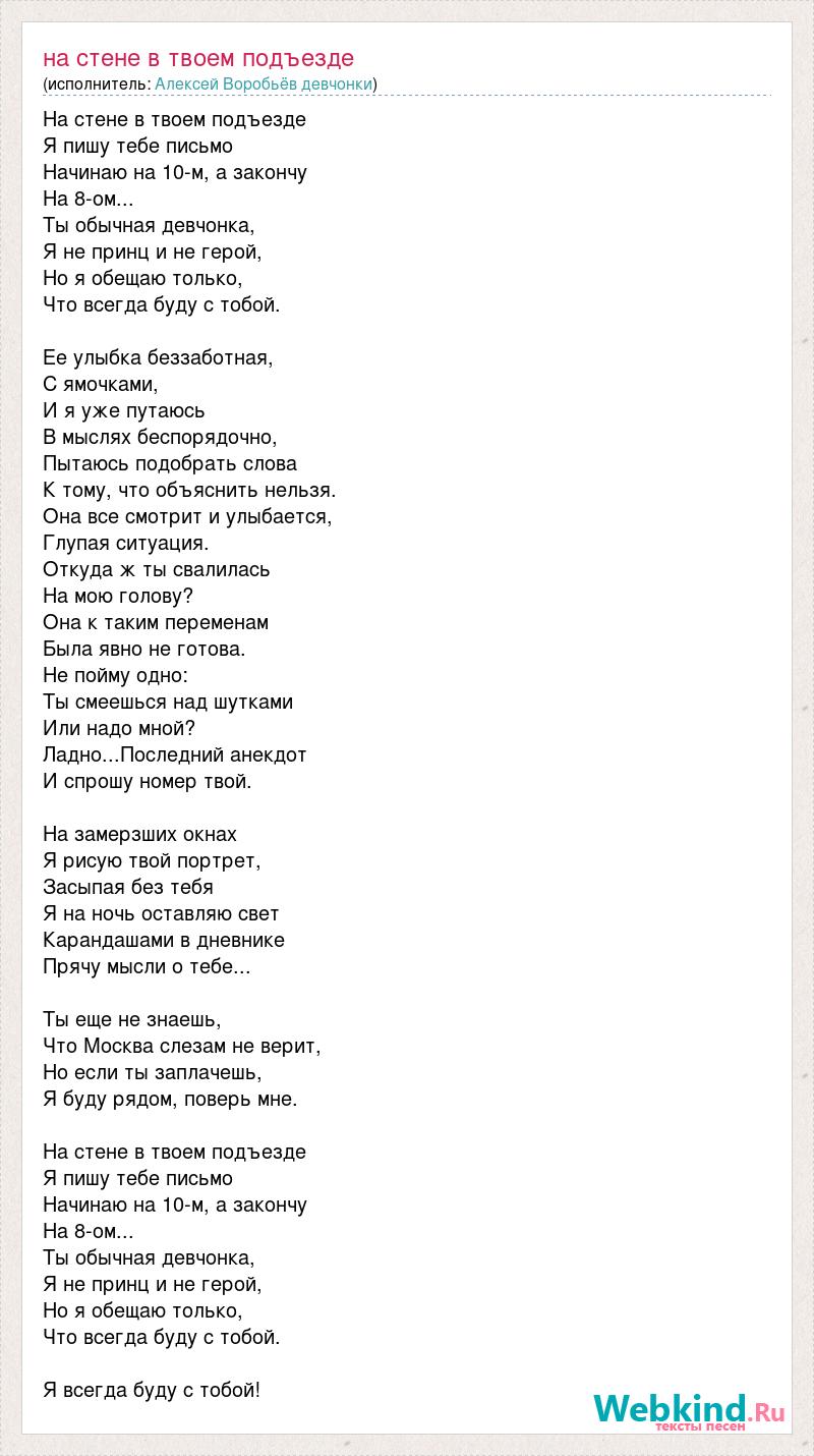 На стене в твоем подъезде Я пишу тебе письмо Начинаю на 10-м, а закончу На 8-ом... Ты обычная девчонка, Я не принц и не герой, Но я обещаю только, Что всегда буду с тобой. Ее улыбка беззаботная, С ямочками, И я уже путаюсь В мыслях беспорядочно, Пытаюсь подобрать слова К тому, что объяснить нельзя. Она все смотрит и улыбается, Глупая ситуация. Откуда ж ты свалилась На мою голову? Она к таким переменам Была явно не готова. Не пойму одно: Ты смеешься над шутками Или надо мной? Ладно...Последний анекдот И спрошу номер твой. На замерзших окнах Я рисую твой портрет, Засыпая без тебя Я на ночь оставляю свет Карандашами в дневнике Прячу мысли о тебе... Ты еще не знаешь, Что Москва слезам не верит, Но если ты заплачешь, Я буду рядом, поверь мне. На стене в твоем подъезде Я пишу тебе письмо Начинаю на 10-м, а закончу На 8-ом... Ты обычная девчонка, Я не принц и не герой, Но я обещаю только, Что всегда буду с тобой. Я всегда буду с тобой!